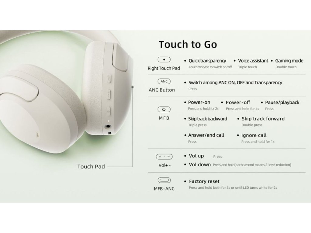 Bezdrátová sluchátka s mikrofonem, ANC, uzavřená konstrukce, 3,5 mm Jack, Bluetooth 5.3, podpora A2DP, AAC, AVRCP, HFP a SBC, Ambient sound, Hi-Res audio, certifikace IPX5, frekvenční rozsah 20-20000 Hz, citlivost 116 dB/mW, impedance 32 Ohm, měnič 40 mm