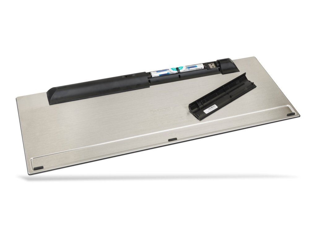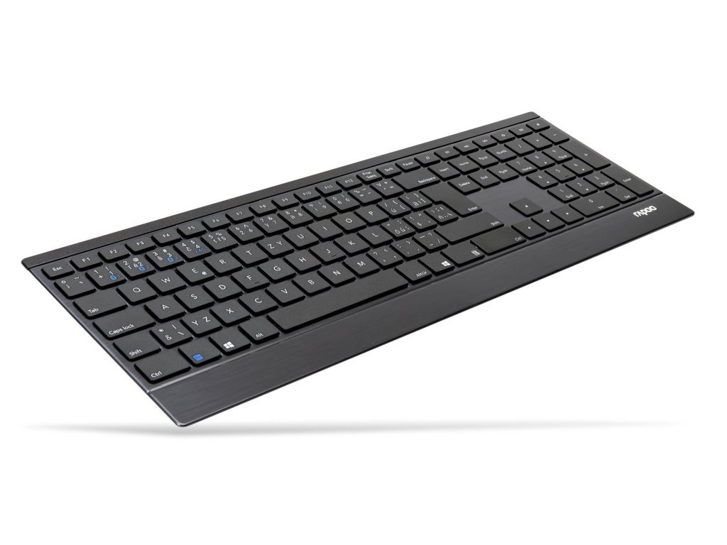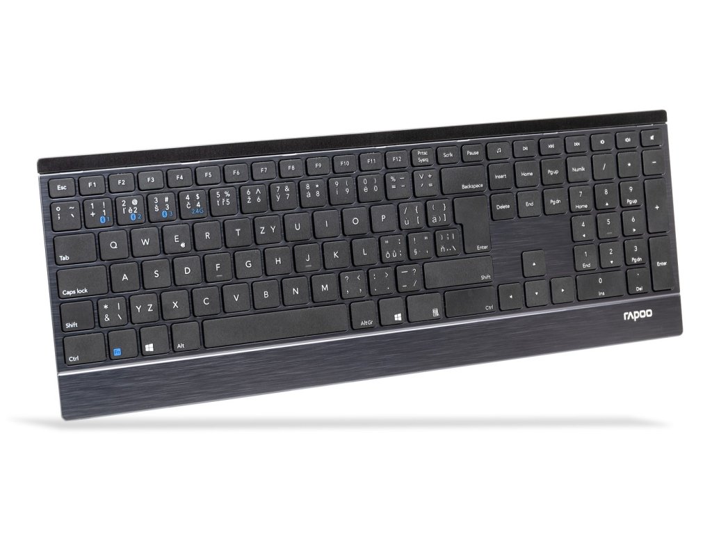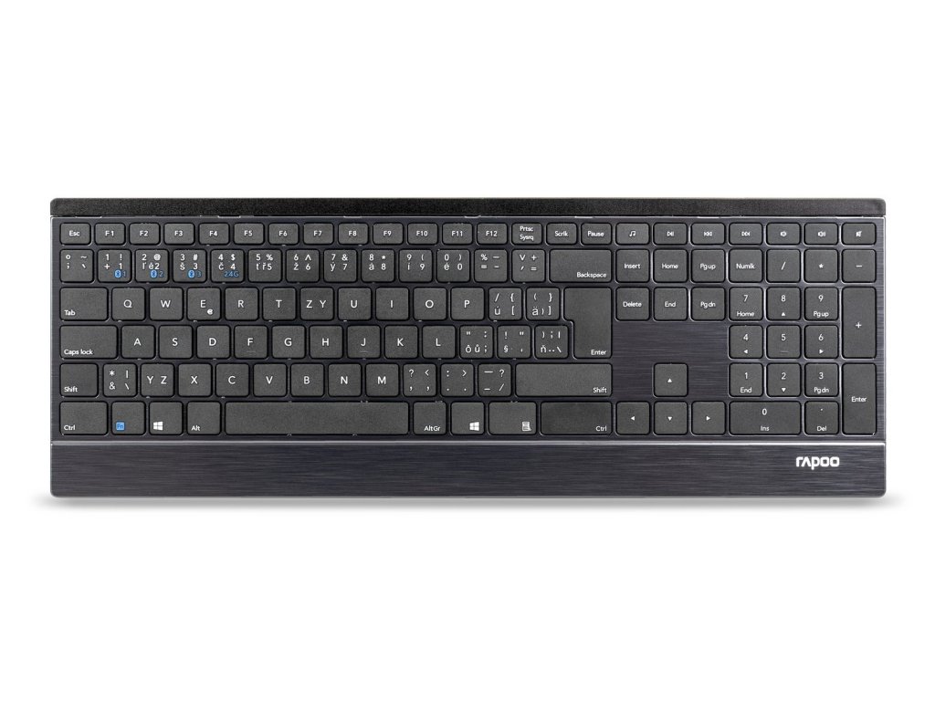 Tato ultratenká klávesnice spojuje prvotřídní materiály se stylovým designem. Tělo klávesnice vyrobené z nerezové oceli a hliníkové slitiny je nejen pevné a odolné, ale zároveň dodává pracovnímu stolu určitý styl. Klávesnice E9500M je nejen vyspělá konstrukcí, ale také funkcionalitou. Nabízí vícerežimovou technologii připojení firmy Rapoo – prostřednictvím spolehlivého bezdrátového vysílače 2,4 GHz, Bluetooth 3.0 a 4.1 – umožňuje současné připojení a přepnutí několika zařízení (s automatickým párováním). Navíc energeticky úsporná technologie firmy Rapoo zajišťuje životnost baterií až 12 měsíců, takže minimalizuje potřebu jejich výměny.