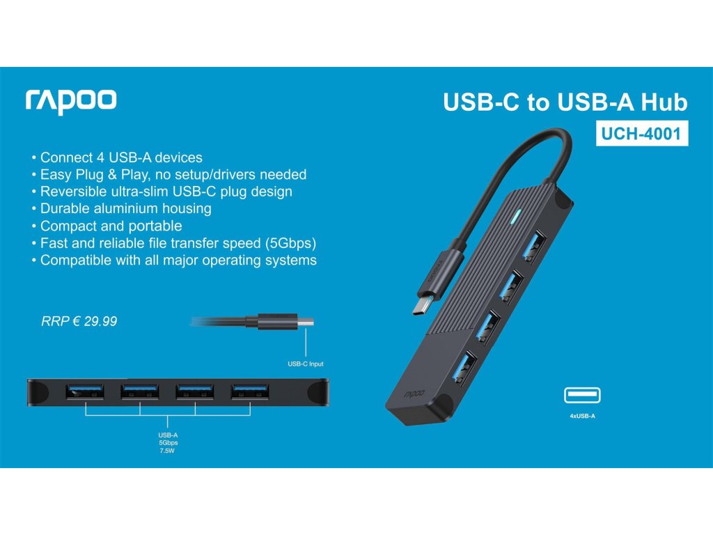 Toto praktické příslušenství od Rapoo musí mít každý, kdo potřebuje používat svá zařízení USB Type-A na svém notebooku USB-C. UCH-4001 umožňuje přidat čtyři porty USB-A a rychle připojit až 4 standardní USB zařízení.
