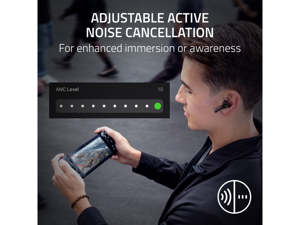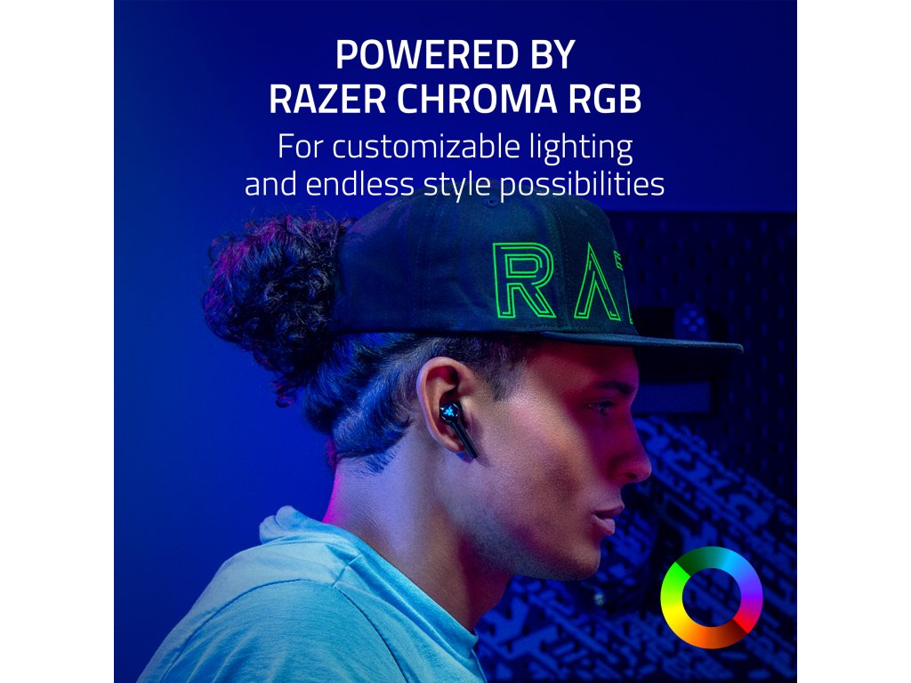 Bezdrátová TWS sluchátka, s mikrofonem, ANC, výdrž baterie sluchátek až 6,5 hodiny + 24 hodin z pouzdra, Razer Chroma RGB podsvícení, frekvenční rozsah 20 Hz – 20 kHz, impedance 16 Ohm, černá