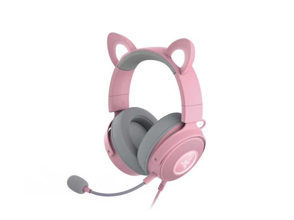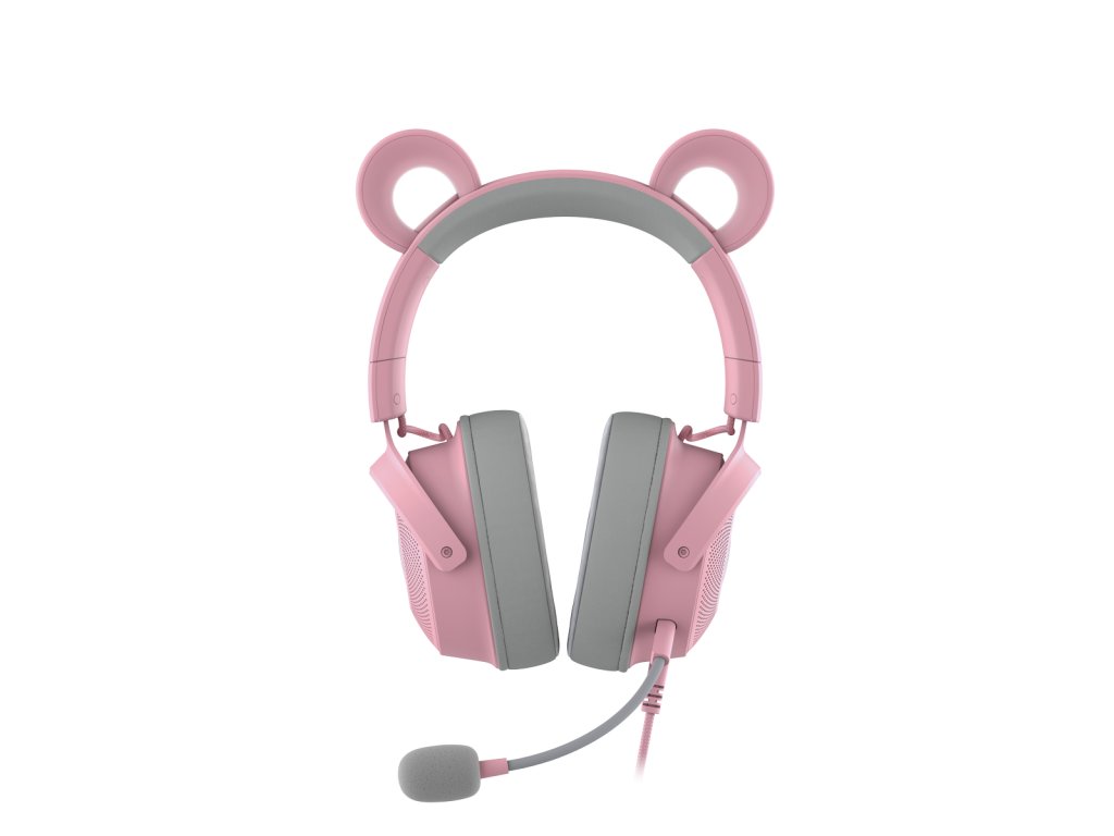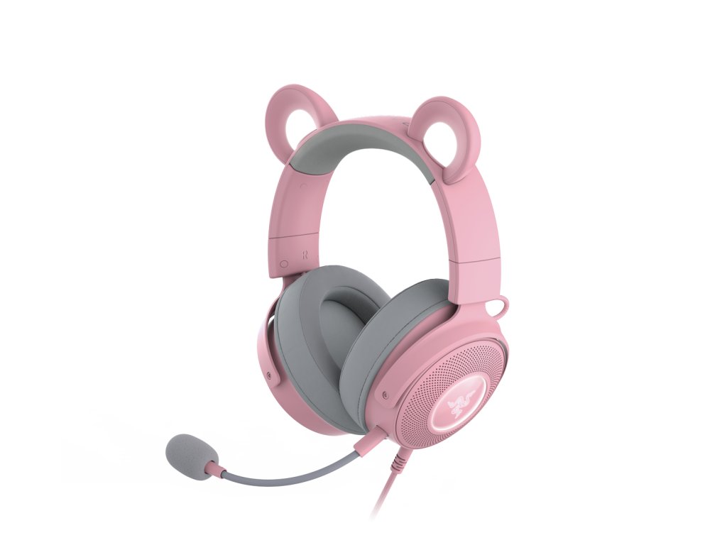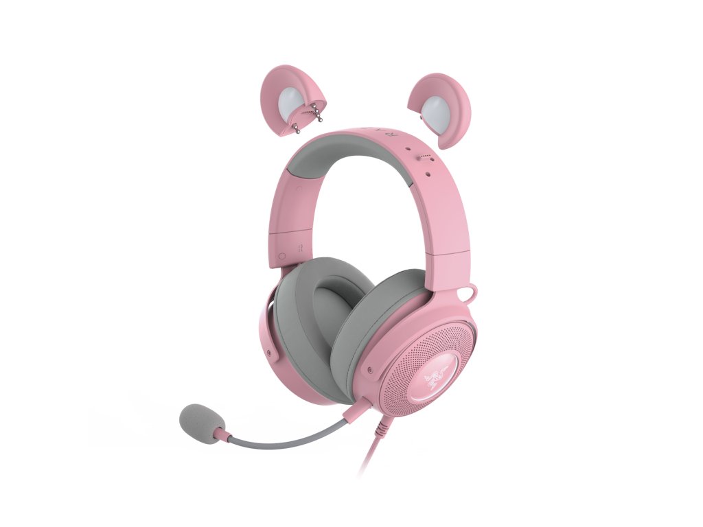 Herní headset, drátový, s mikrofonem, USB, prostorový zvuk 7.1, Razer Chroma RGB podsvícení, frekvenční rozsah 20 Hz – 20 kHz, impedance 32 Ohm, s oušky (3 sady - medvědí, kočičí, králičí), růžový