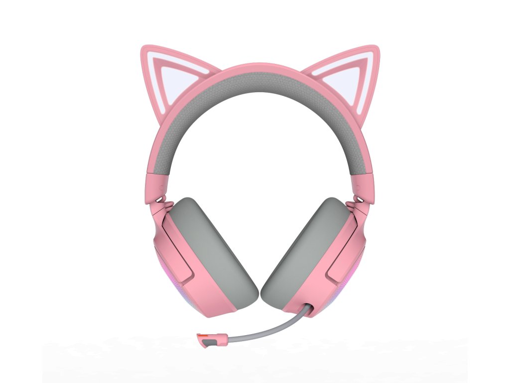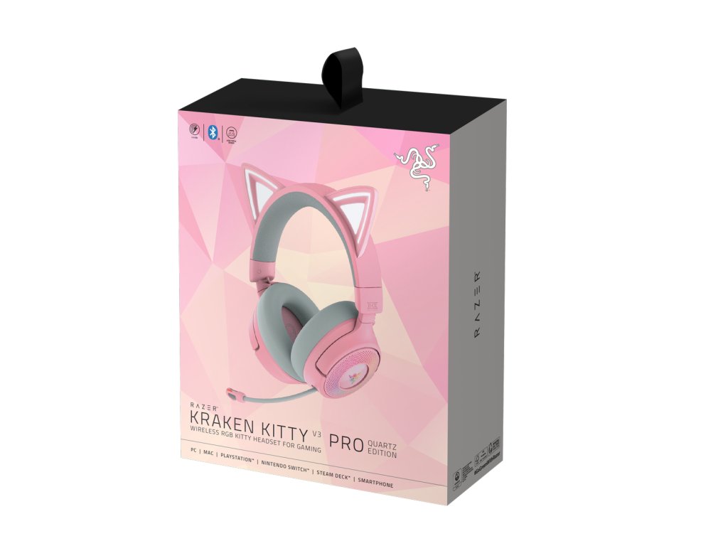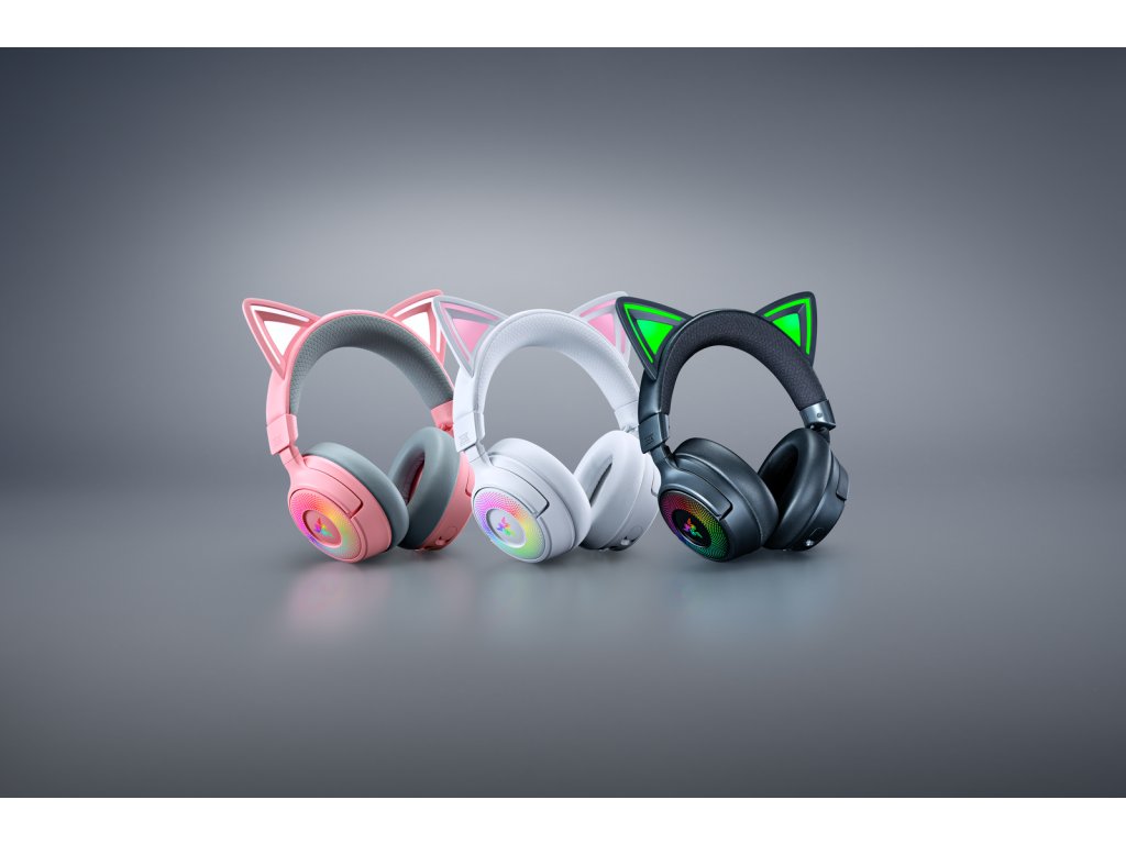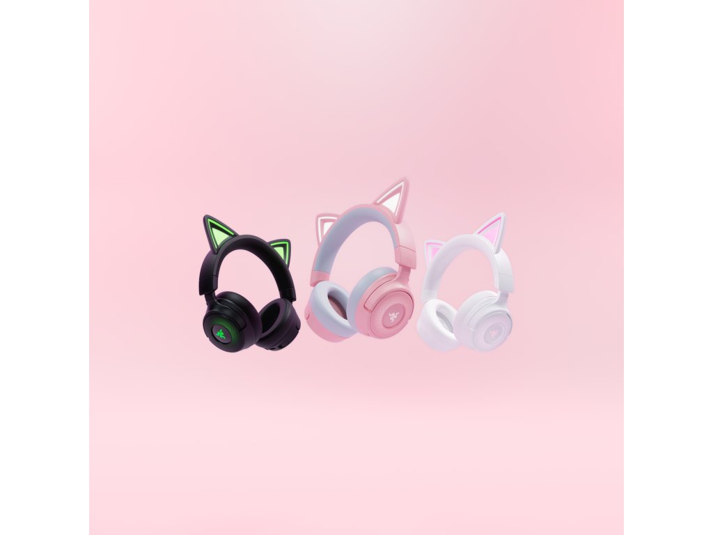 Udělejte si proslov s bezdrátovými herními sluchátky Razer Kraken Kitty V3 Pro s nejikoničtějším designem kočičích náušníků ve světě her, podsvícenými technologií Razer Chroma™ RGB. Díky 3 všestranným režimům připojení, super širokopásmovému mikrofonu a reaktivnímu osvětlení buďte roztomilí, pohodlní a stylově soutěživí.