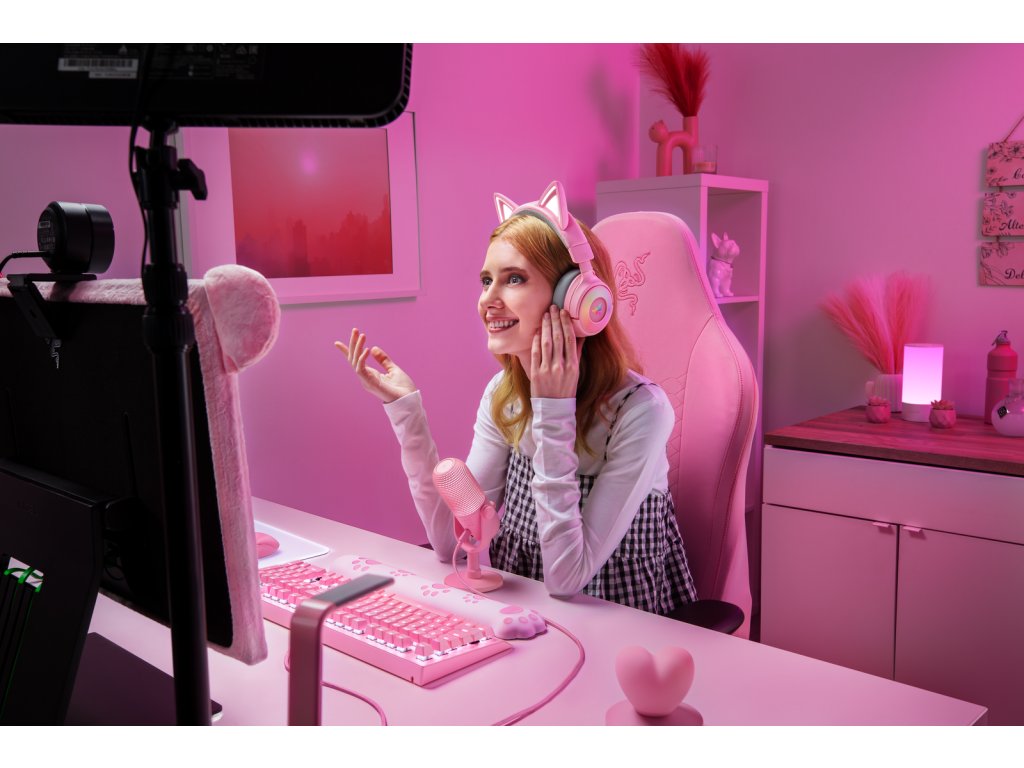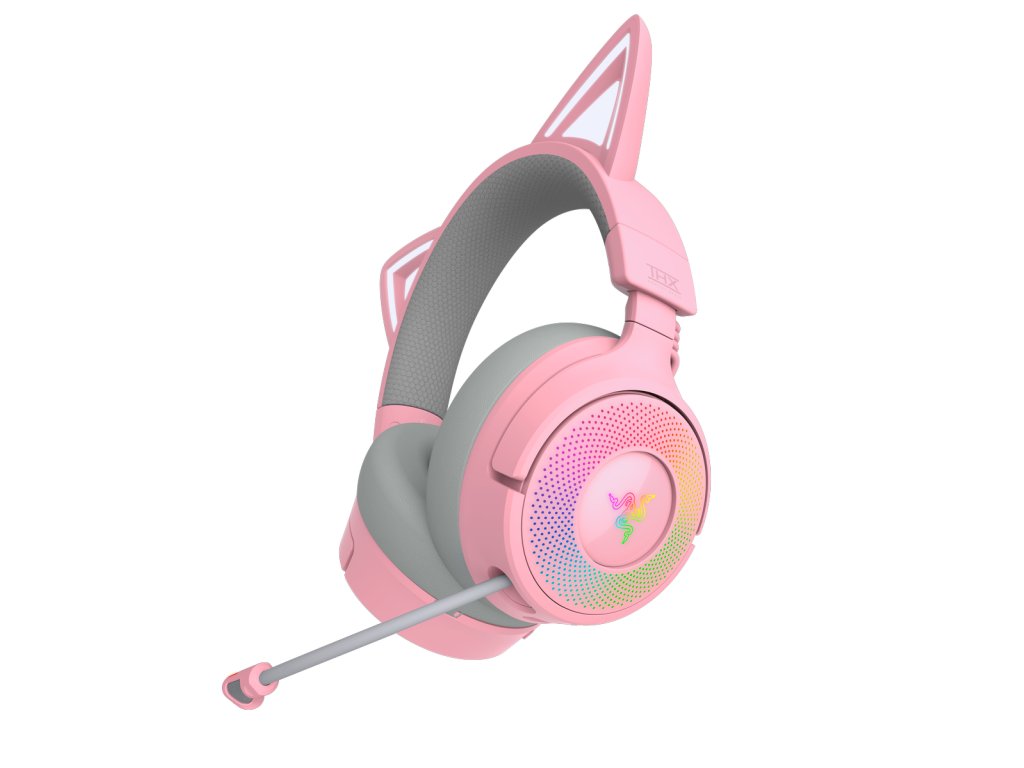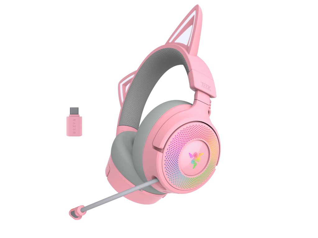 Herní headset, bezdrátový, s mikrofonem, 2,4 GHz/Bluetooth/USB, výdrž baterie až 70 h, frekvenční rozsah 20 Hz – 28 kHz, impedance 32 Ohm, Razer Chroma RGB podsvícení, s oušky, růžový