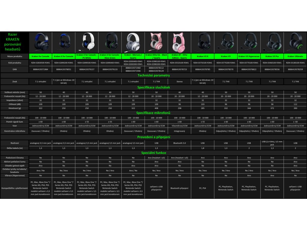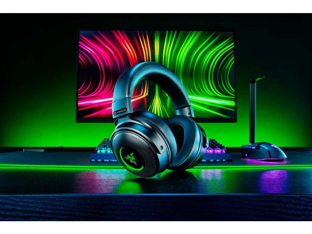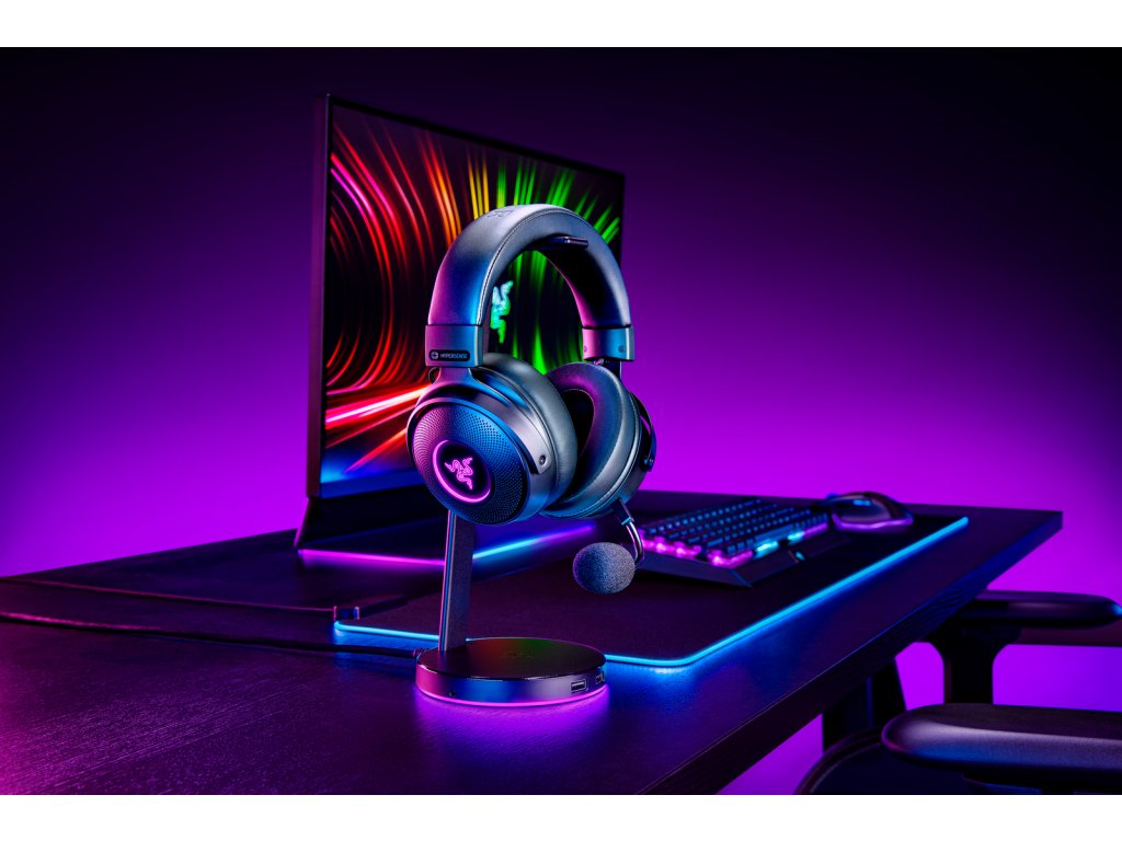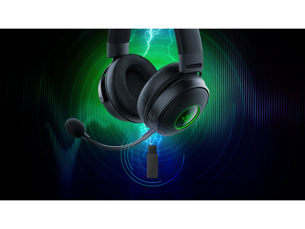 Herní headset, bezdrátový, s mikrofonem, prostorový zvuk 7.1, výdrž bateria až 44 hodin, Razer Chroma RGB podsvícení, haptická odezva, frekvenční rozsah 20 Hz – 20 kHz, impedance 32 Ohm, černý