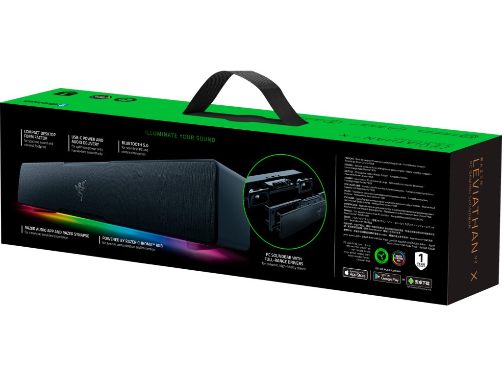 Razer Leviathan V2 X, vyzbrojený dvěma měniči s plným rozsahem a dvěma pasivními zářiči pro odvážnou čistotu a rezonující hloubku, poskytuje strhující zvukový zážitek v celé vaší zábavě.