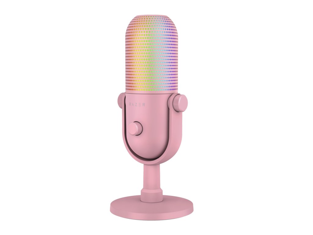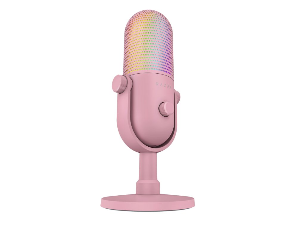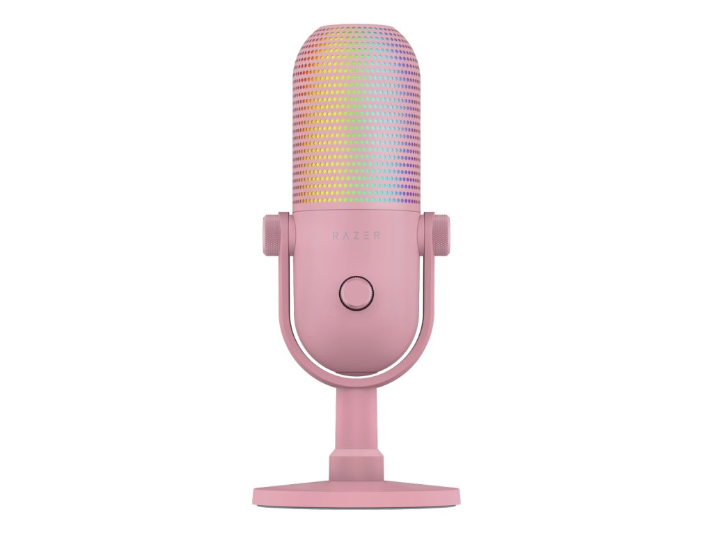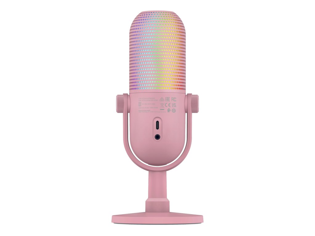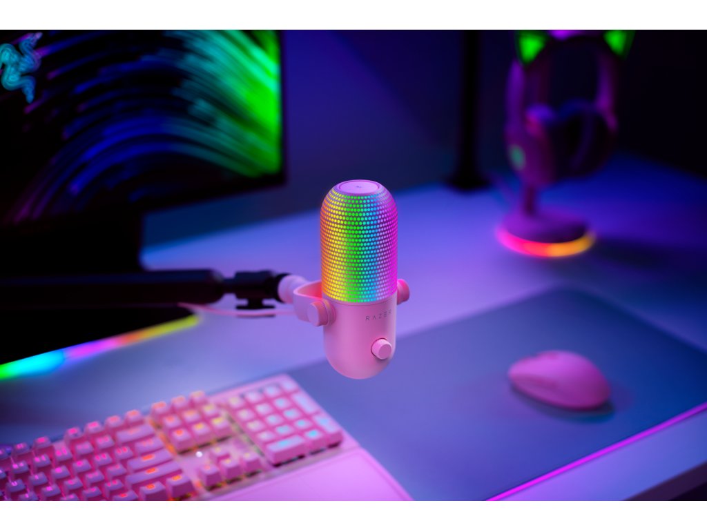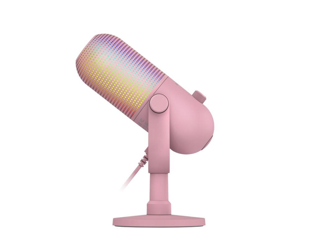 Stolní mikrofon, kondenzátorový, USB, Razer Chroma RGB podsvícení, funkce Tap-to-Mute - ztlumení klepnutím, růžový