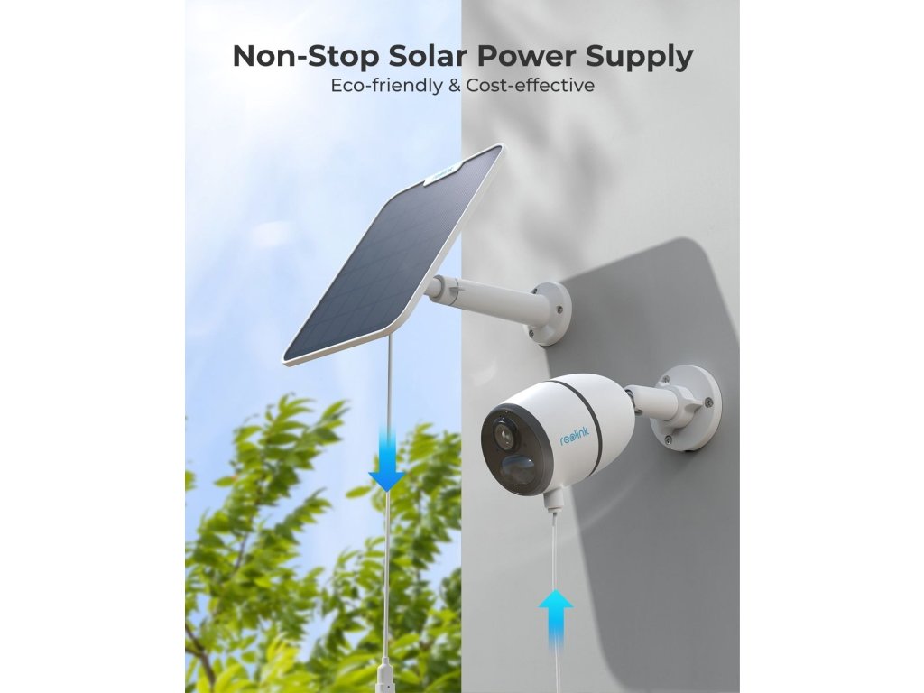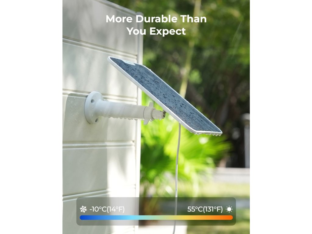 Reolink Solární panel udržuje Vaši kameru nabitou i bez napájení ze sítě. Solární panel lze ke kameře připojit díky čtyřmetrovému napájecímu kabelu, který je součástí balení. Konektor na panelu je moderní USB-C, který Vám zaručí ještě efektivnější nabíjení. Nástěnná konzole, která se může otáčet o 360°, usnadní přesné nasměrování solárního panelu a maximalizuje dopadající sluneční světlo. Panel se hodí do každého počasí.