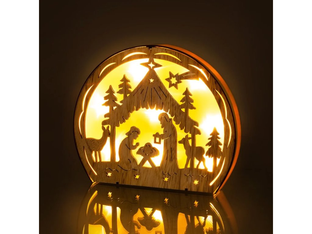 vánoční osvětlení - jesličky z dřevěné překližky • 3D světelný efekt pozadí • 8 LED • barva světla: teplá bílá • rozměry: 220 x 185 x 30mm • vhodné pouze pro vnitřní použití (IP20) • napájení: 2xAAA (nejsou součástí balení)