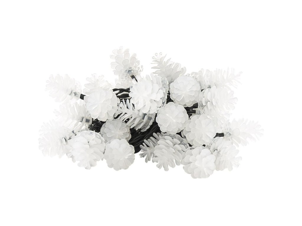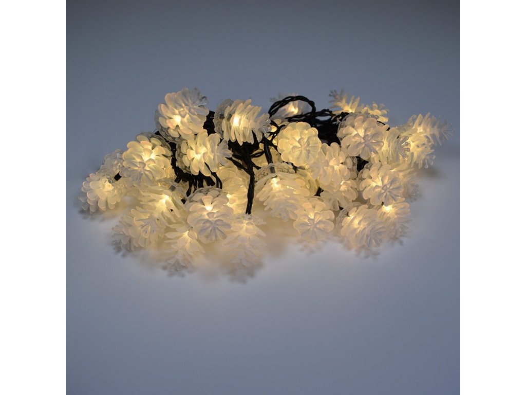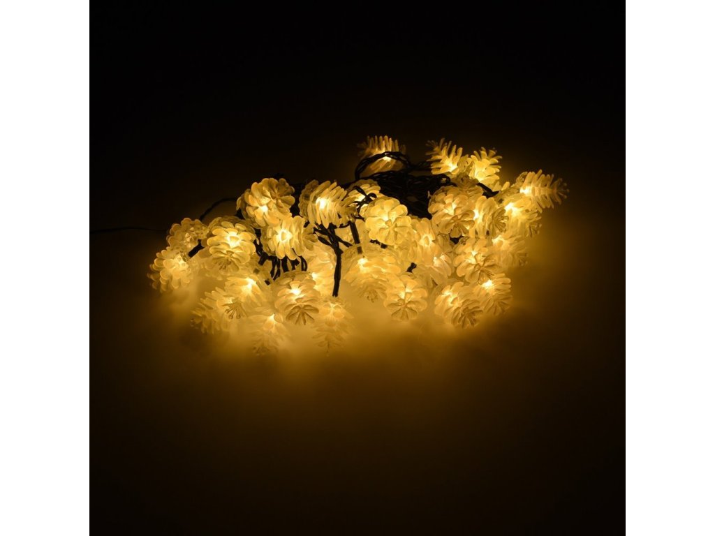 vánoční LED řetěz • borové šišky • 40× LED • délka 10 m • 5m přívodní šňůra • použití v interiéru i exteriéru • časovač 6/18 hod • příkon 2,1 W • teplá bílá barva • napájení ze sítě • krytí IP44 • doporučená výška stromku 1,3 m