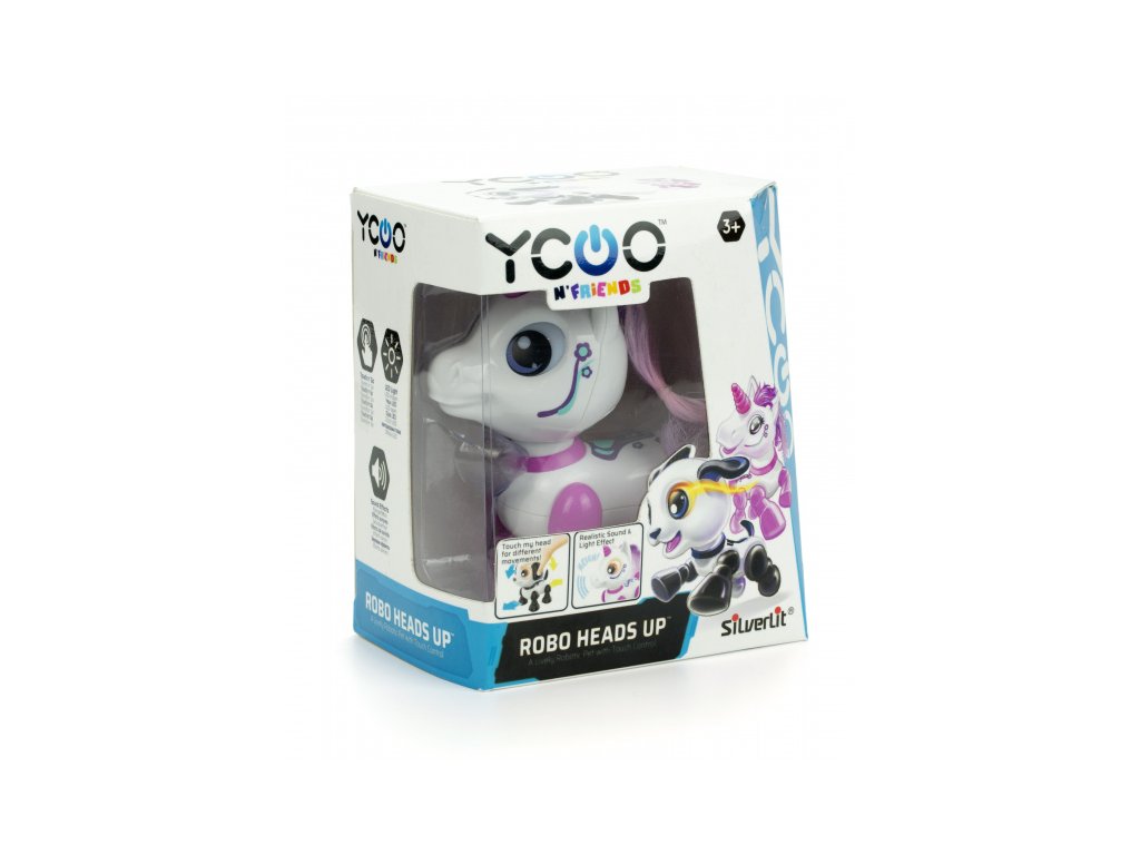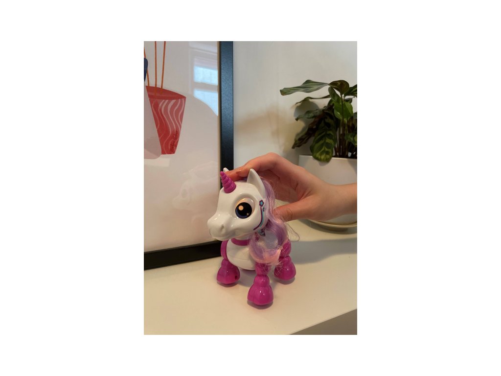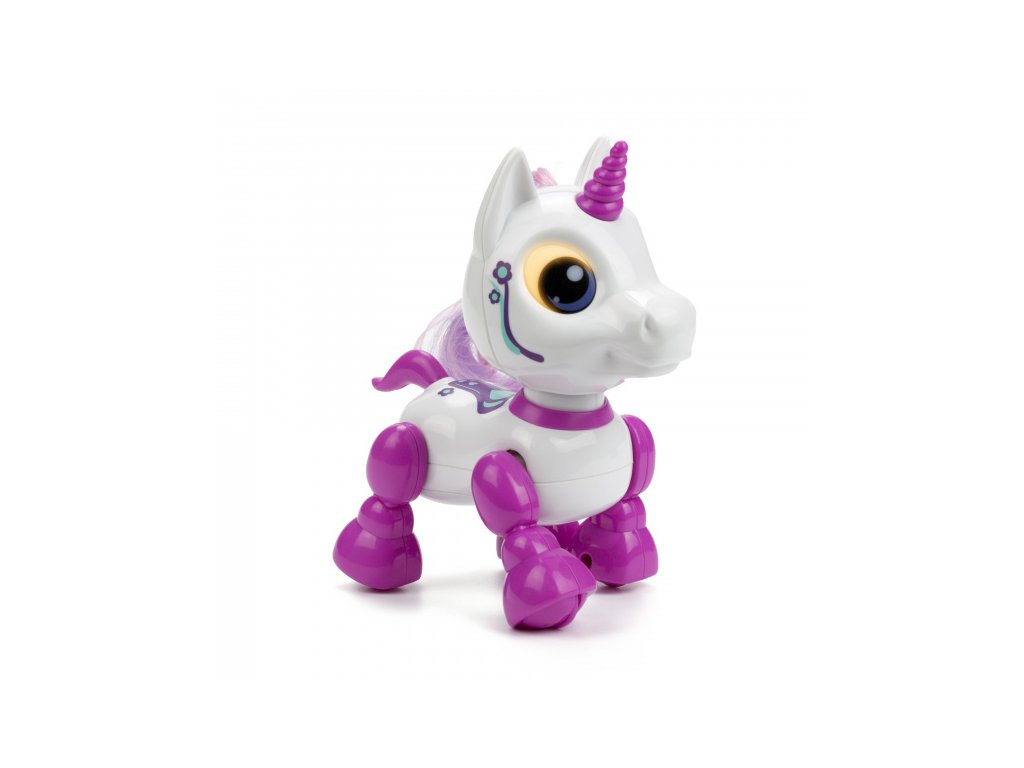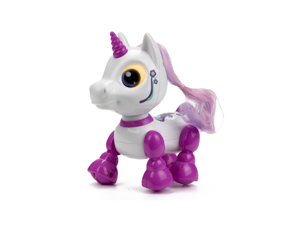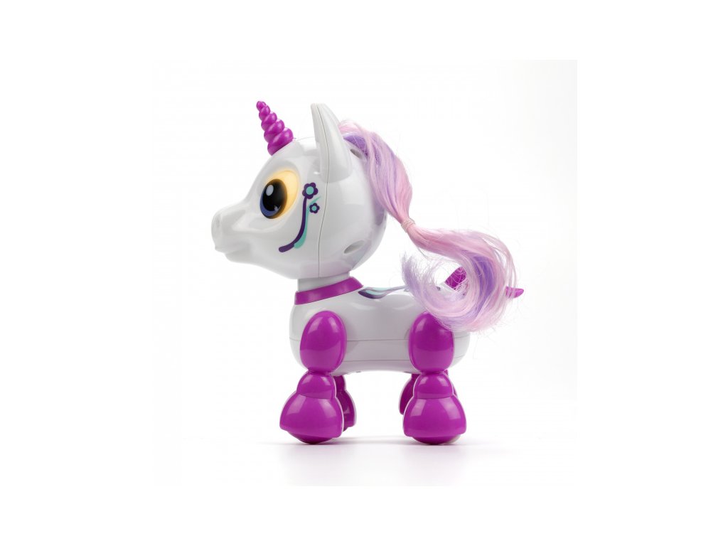 Interaktivní robot Jednorožec, který chodí, hýbe hlavou, má LED oči a vydává zvuky.