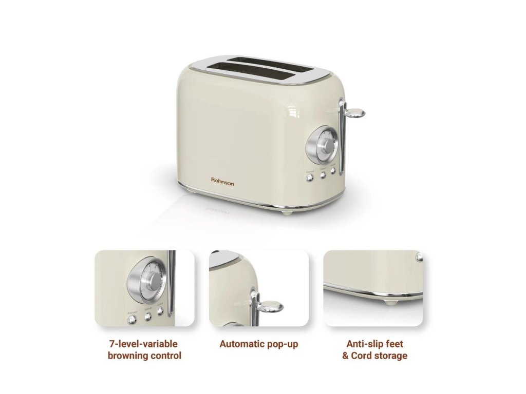 Topinkovač pro 2 plátky, 7 úrovní opečení, 800W, barva krémová, 3 funkce: rozmrazování, ohřev a okamžité přerušení provozu, výsuvná miska na drobky, světelná indikace provozu, protiskluzové nožičky.