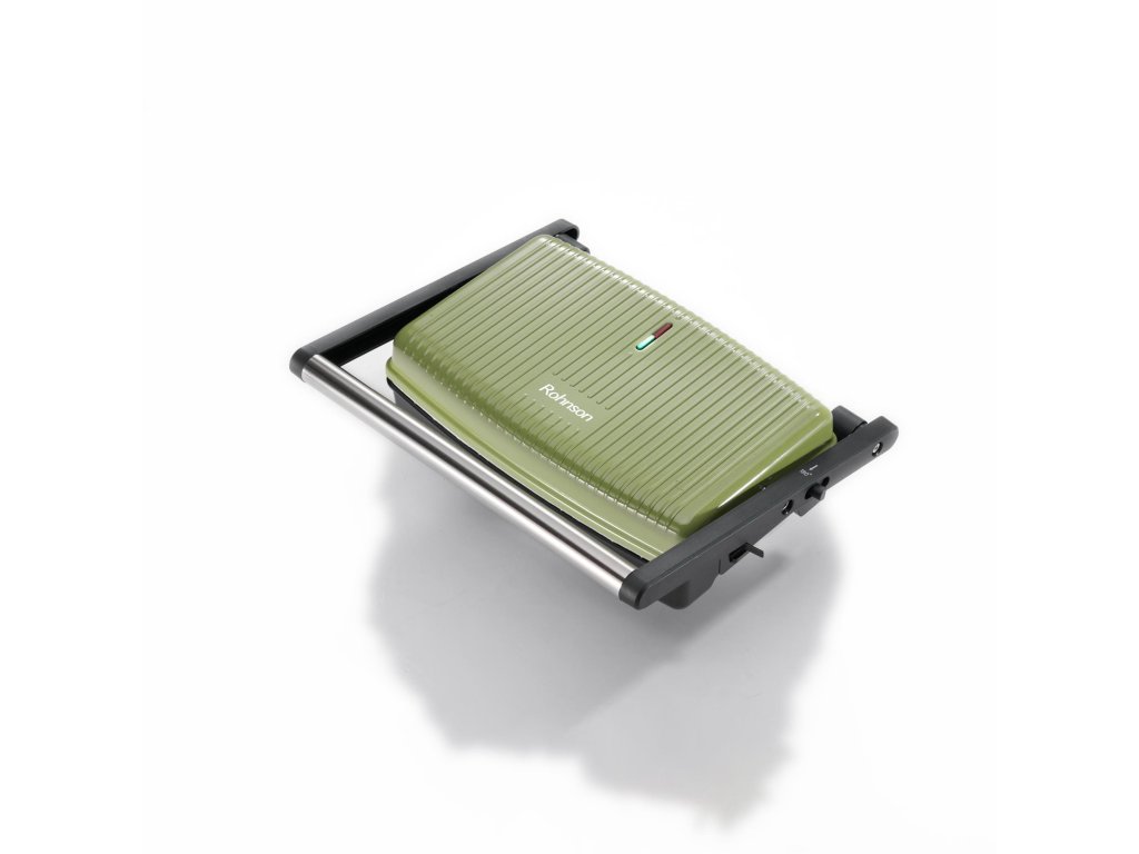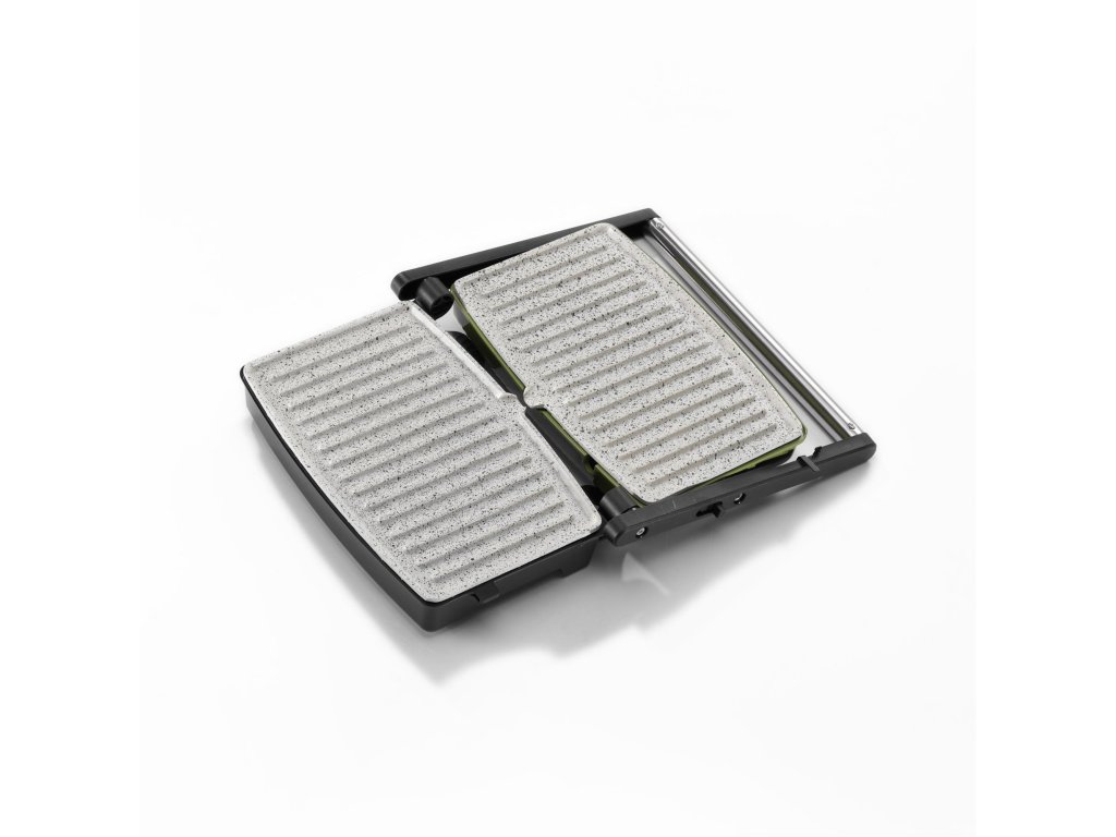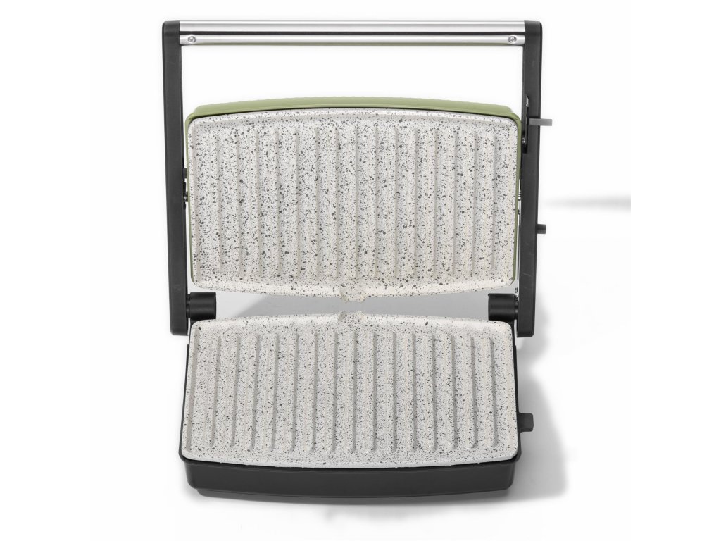 Sendvičovač s velkými pečicími pláty 27,5 x 18 cm, barva zelená, příkon 1500 W.