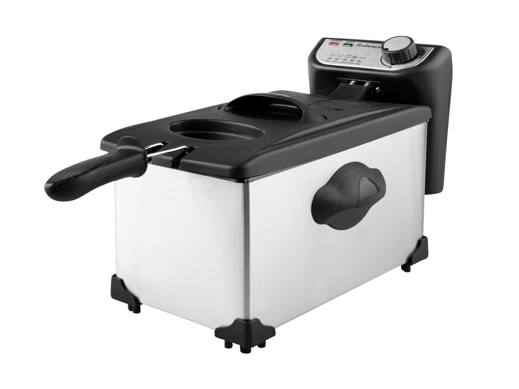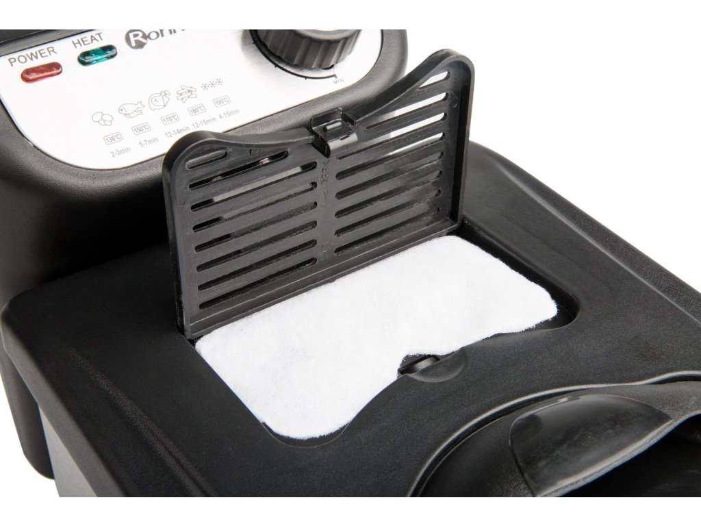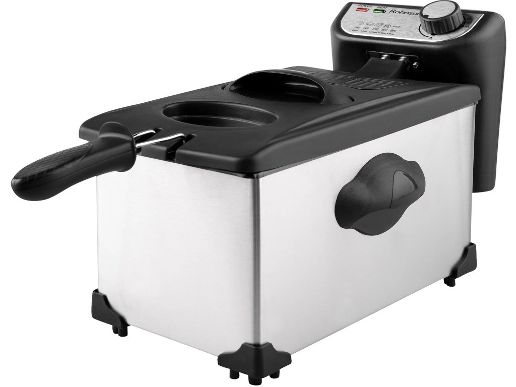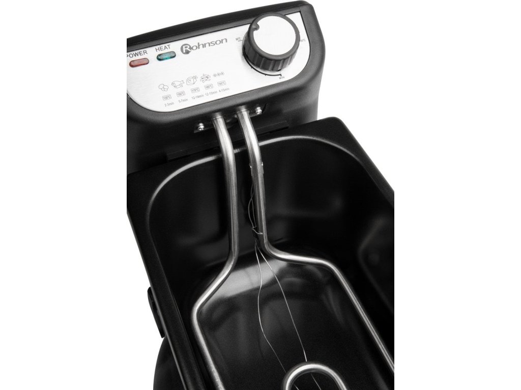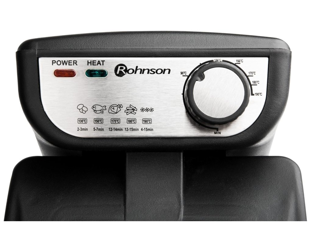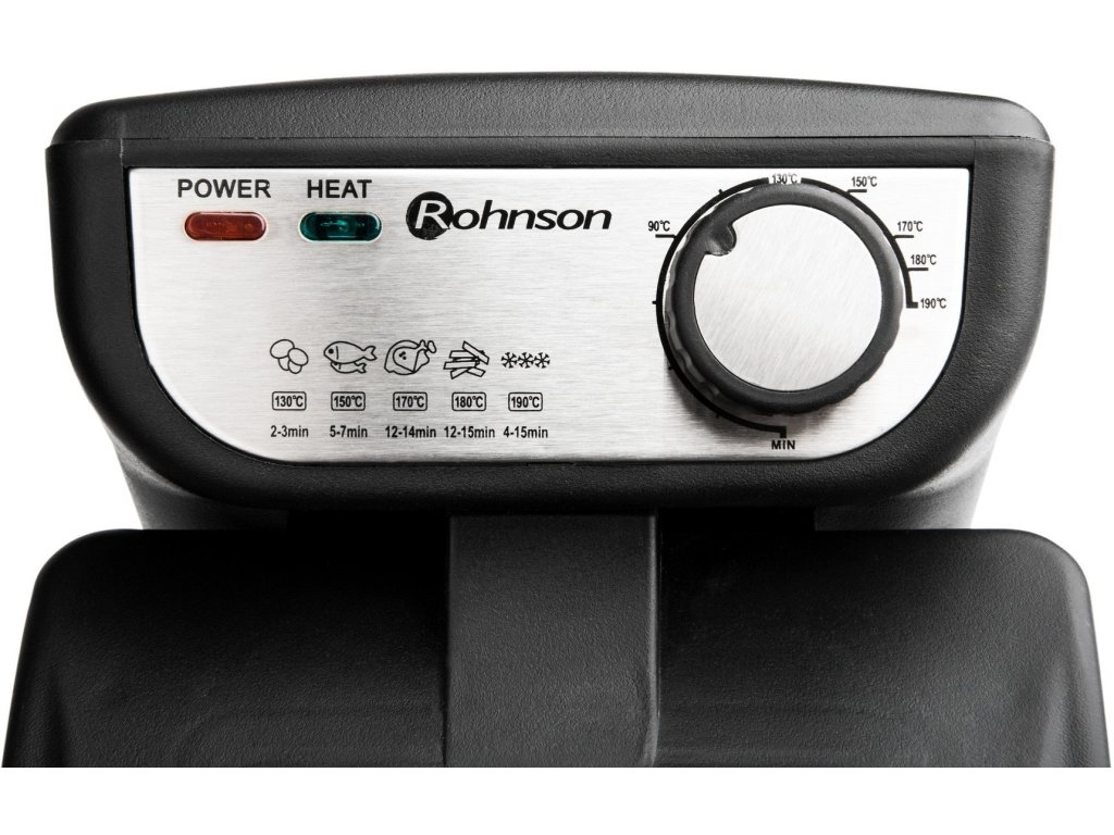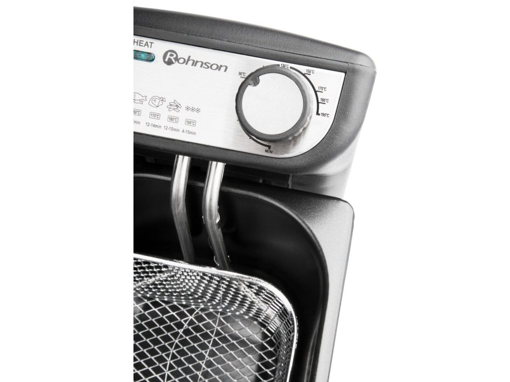 ROHNSON R-281 Fritéza, Kapacita 3 l oleje, Vnější povrch z nerezové oceli, Nastavitelná teplota až do 190 °C, indikace provozu, Bezpečnostní pojistka proti přehřátí a uskladnění napájecího kabelu