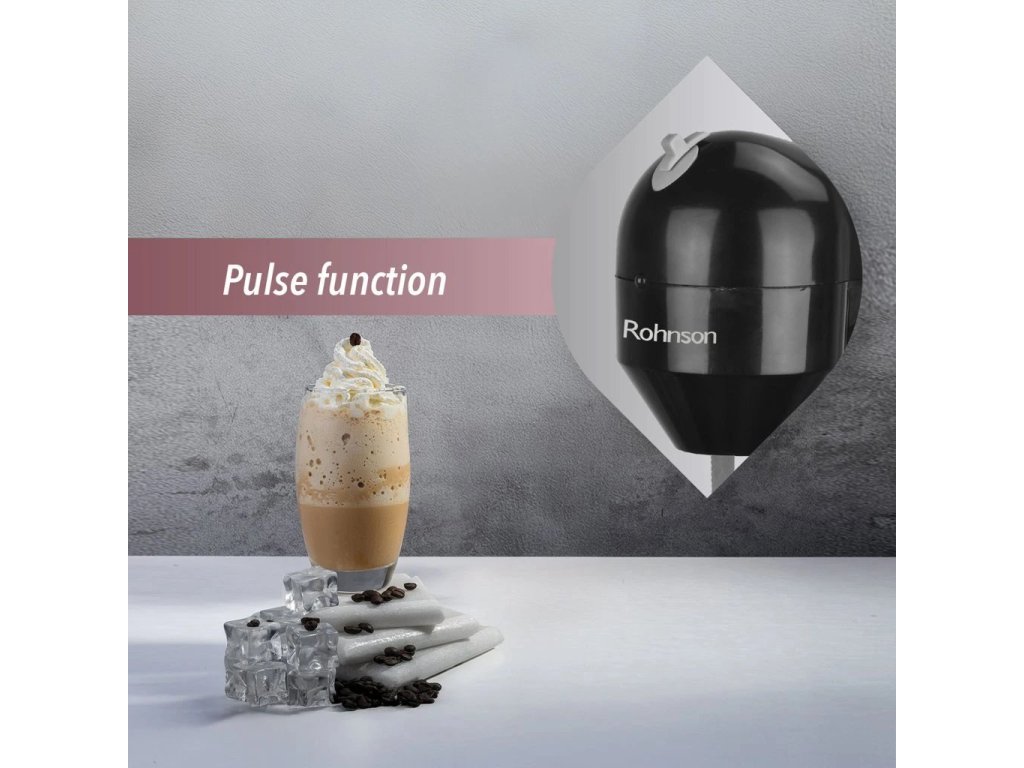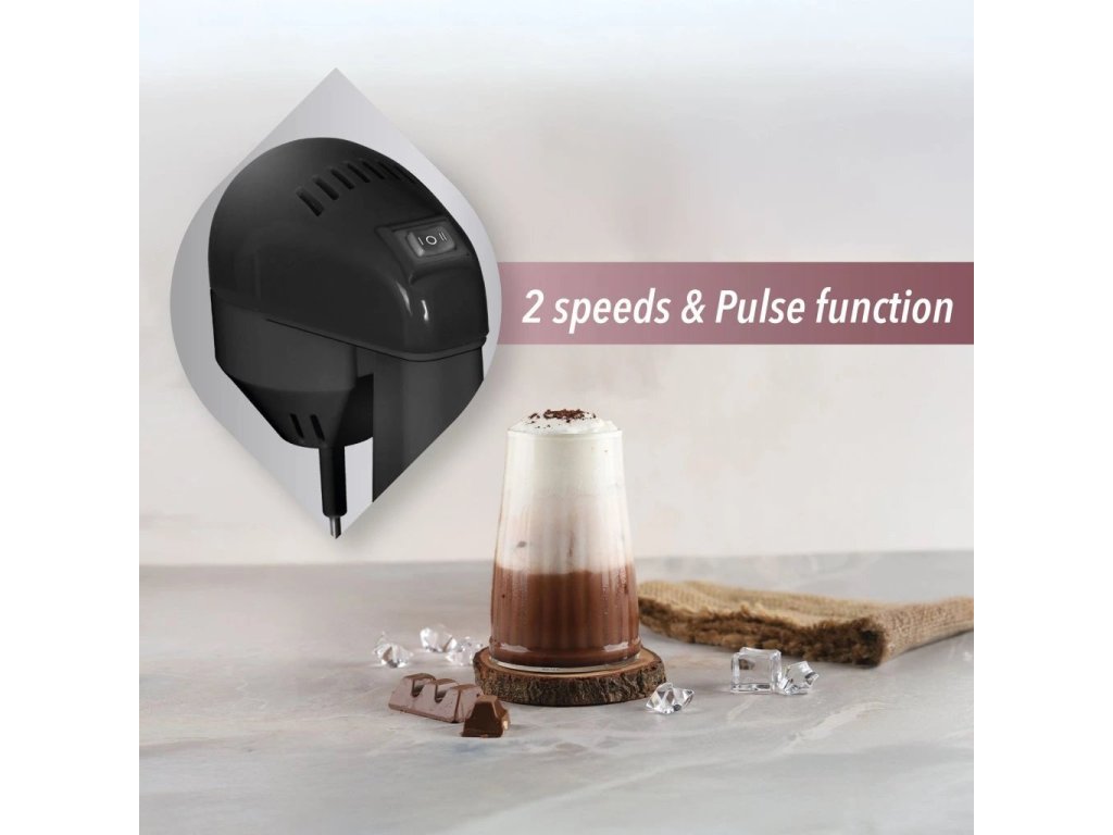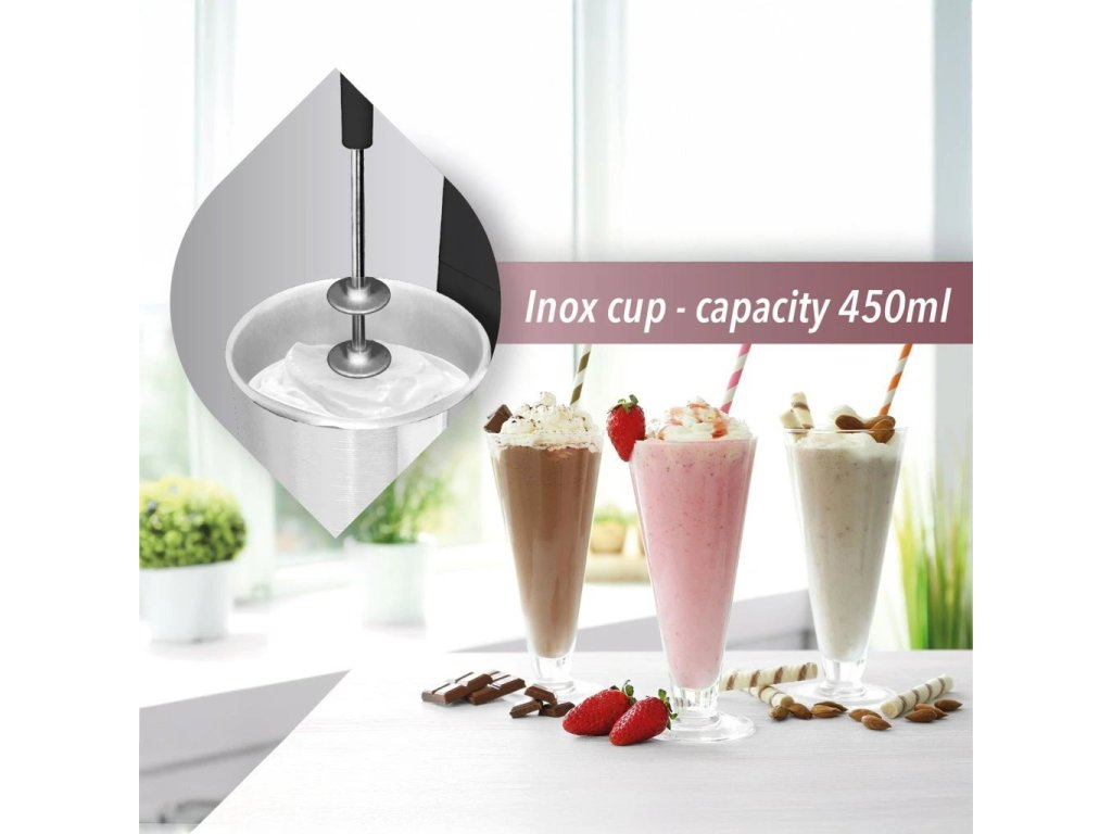Mixér na frappé, 2 rychlosti a pulzní funkce, nerezová vyjímatelná nádobka s objemem 450 ml, nízká hlučnost, příkon 100 W.