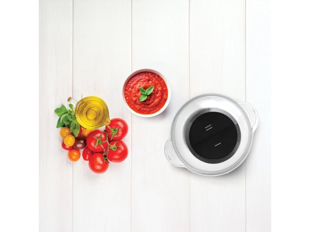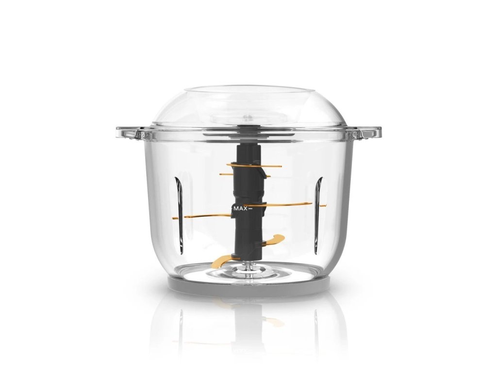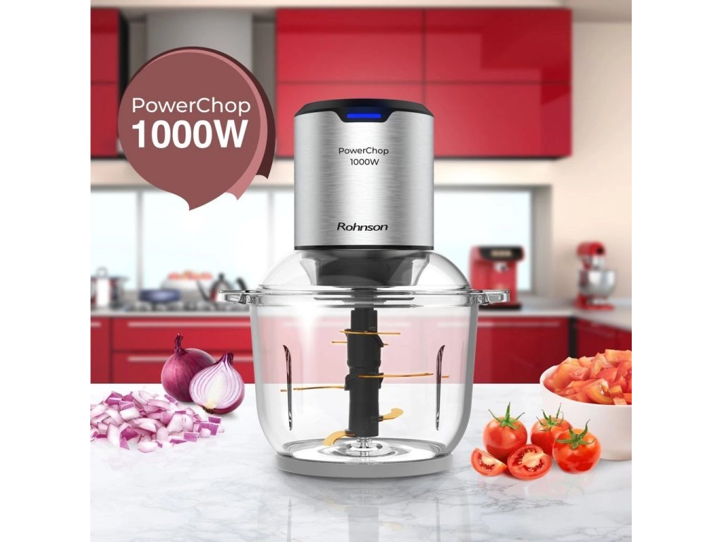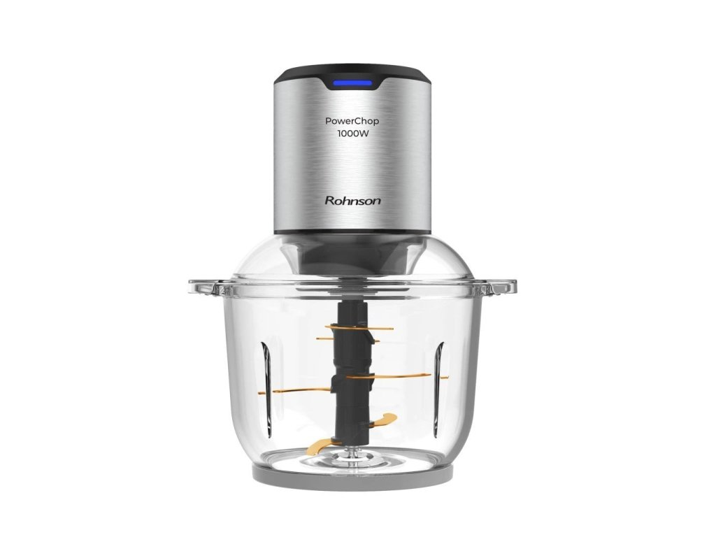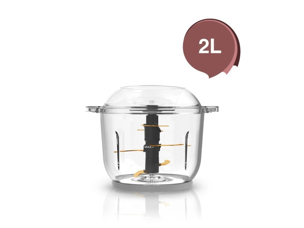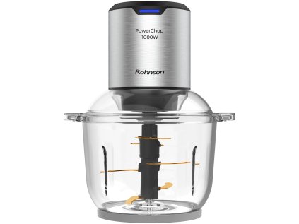 Sekáček potravin 1000W, 6 sekacích nožů s titanovou úpravou, objem nádoby 2 litry, pevný a odolný nerezový a plastový plášť pro maximální bezpečnost, 2 rychlosti, modrá světelná indikace provozu, vhodný pro drcení ledu.