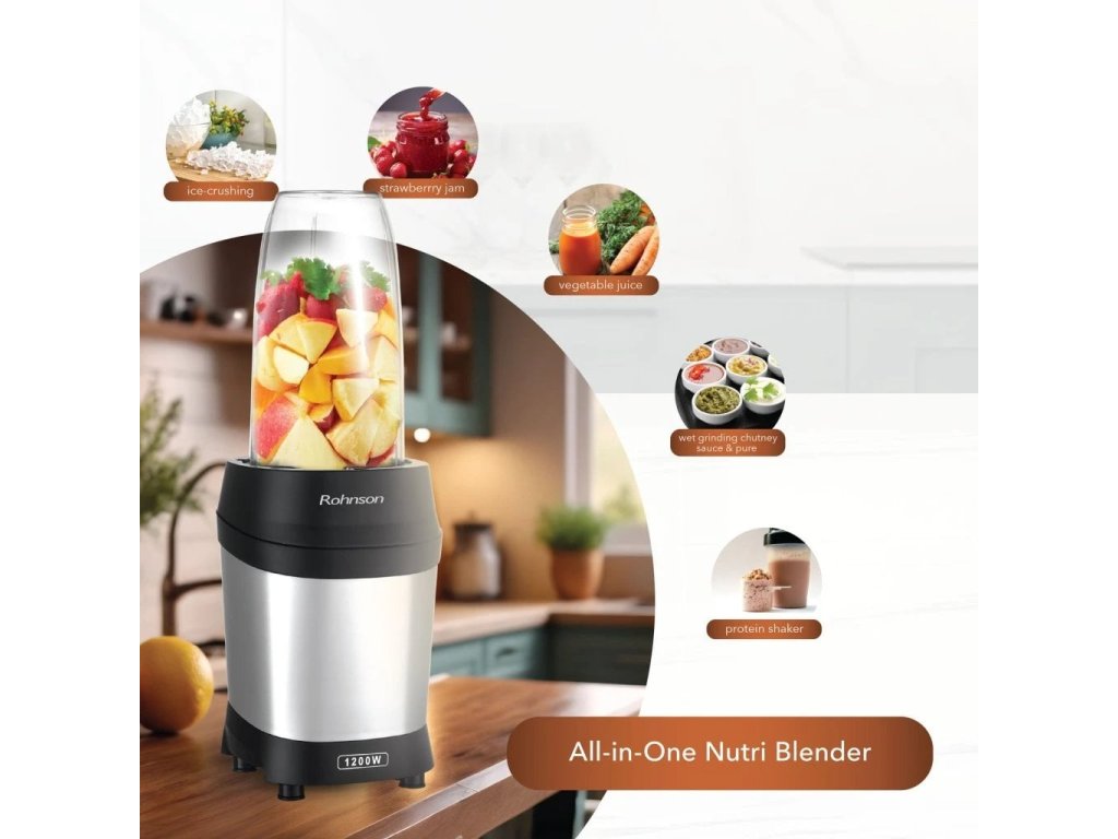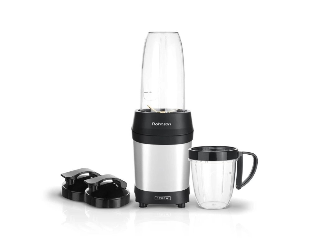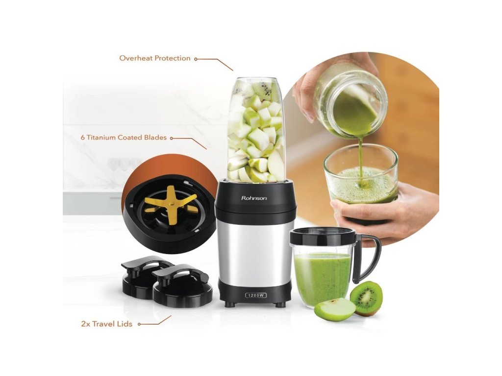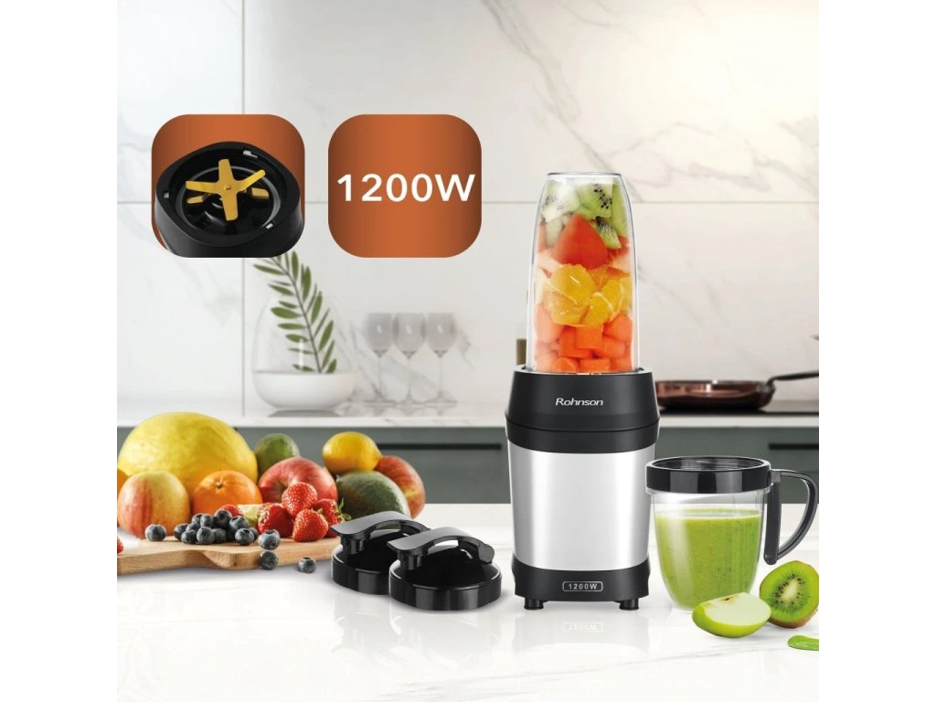 Smoothie mixér, výkon 1200 W, 6 nožů s titanovou úpravou, objem nádob 950 a 500 ml.