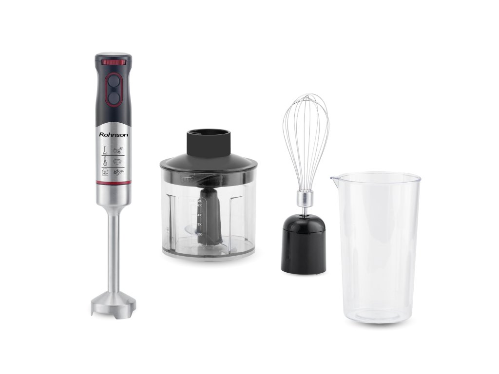 Příslušenství: sekáček potravin 500 ml, mixovací nádoba s měrkou 700 ml, nerezová šlehací metla