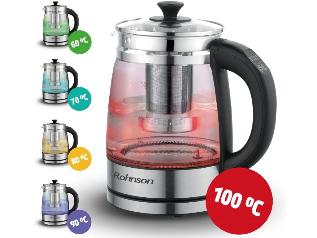Skleněná rychlovarná konvice Možnost nastavení teploty vody 60, 70, 80, 90 a 100 °C