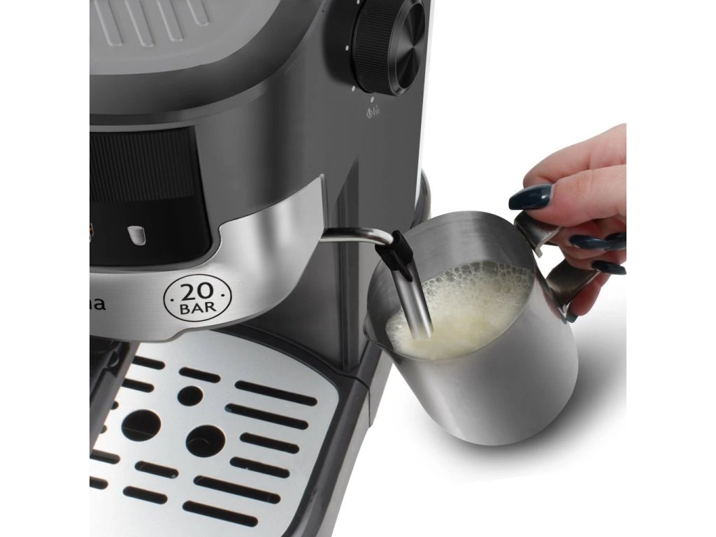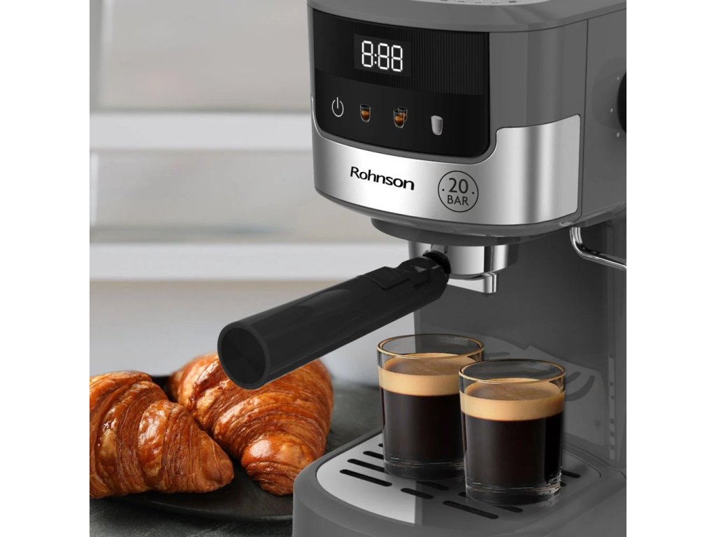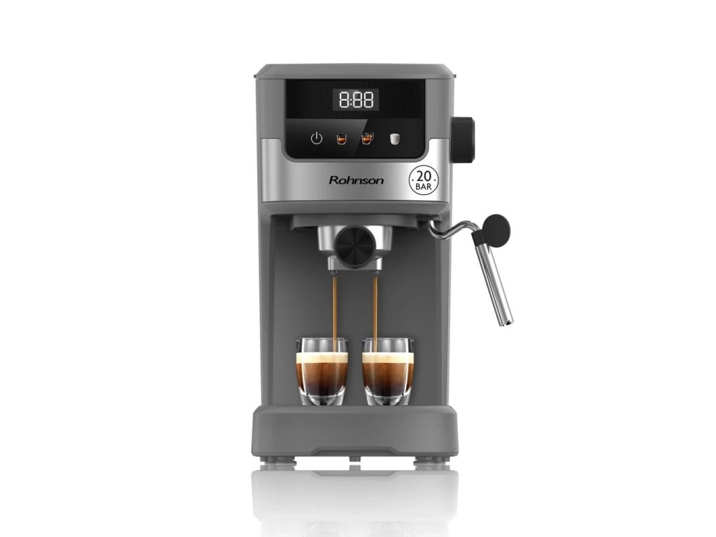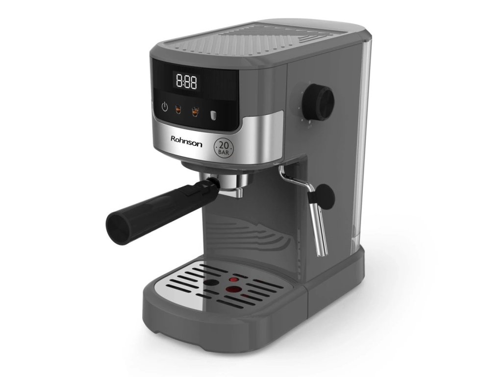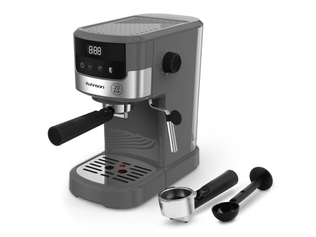 Espresso pákový kávovar, barva šedá, příkon 1100W, zásobník na vodu 1,25 l, vysokotlaká extrakce 20 barů, vysokotlaká tryska, LED digitální dotykový ovládací panel, snadné čištění, filtr pro přípravu jednoho nebo dvou šálků kávy.