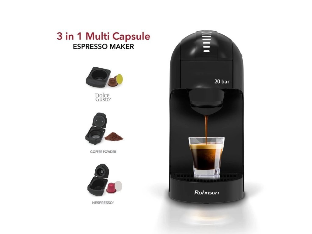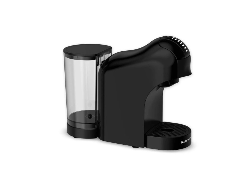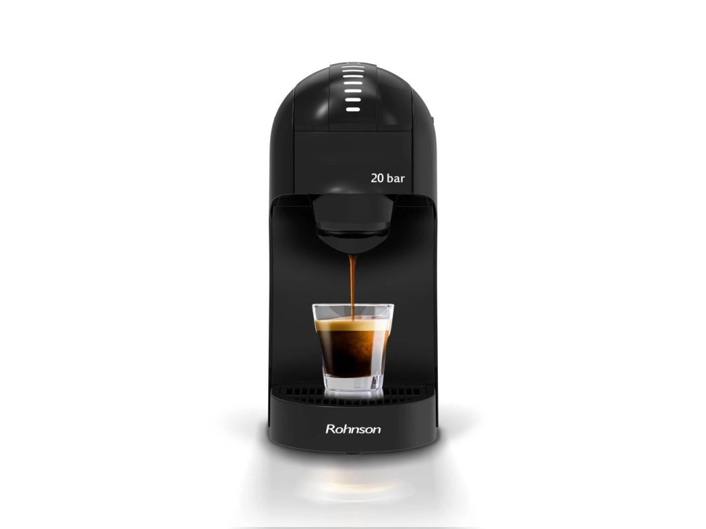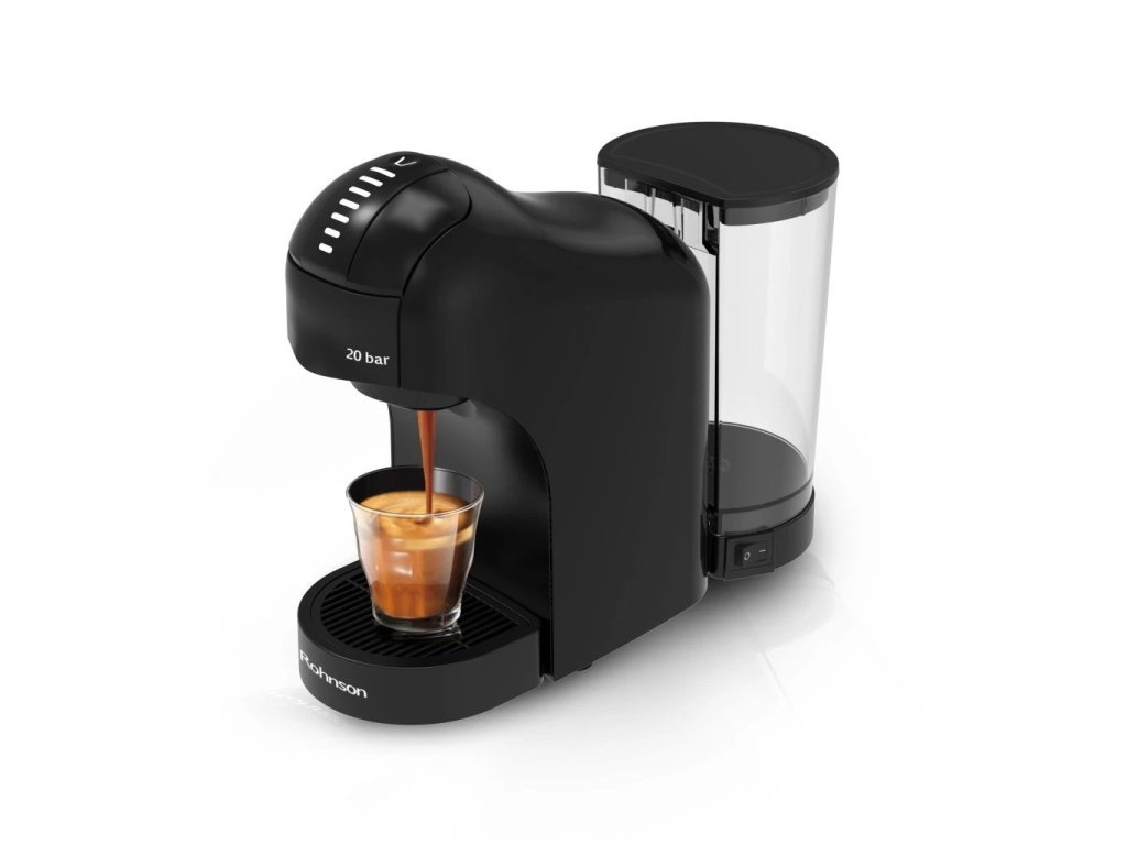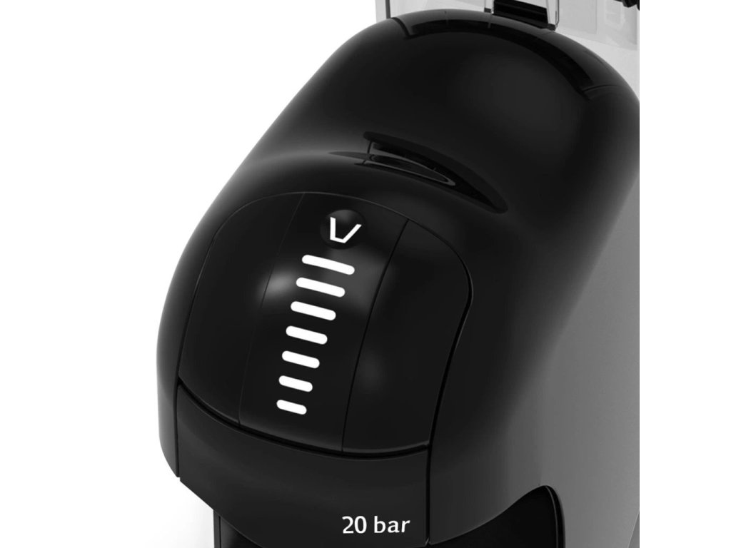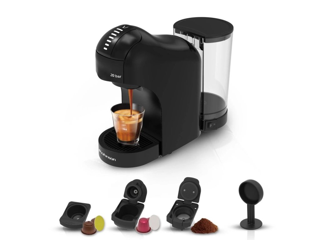 Kávovar na kapsle značky Nespresso, Dolce Gusto či na mletou kávu, s příkonem 1400W, vysokotlaká extrakce 20 barů, 7 úrovní množství hotové kávy, odnímatelný průhledný zásobník na vodu o objemu 0,85l.