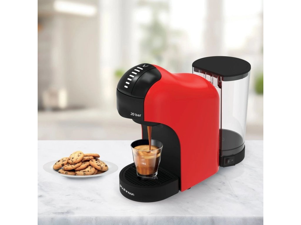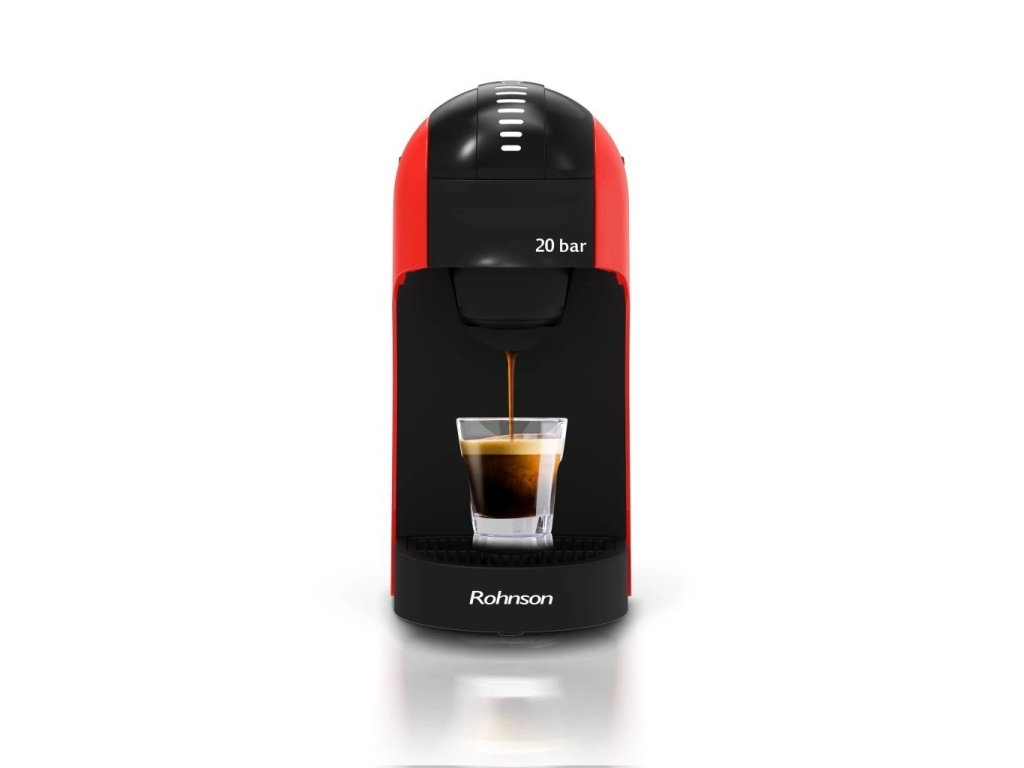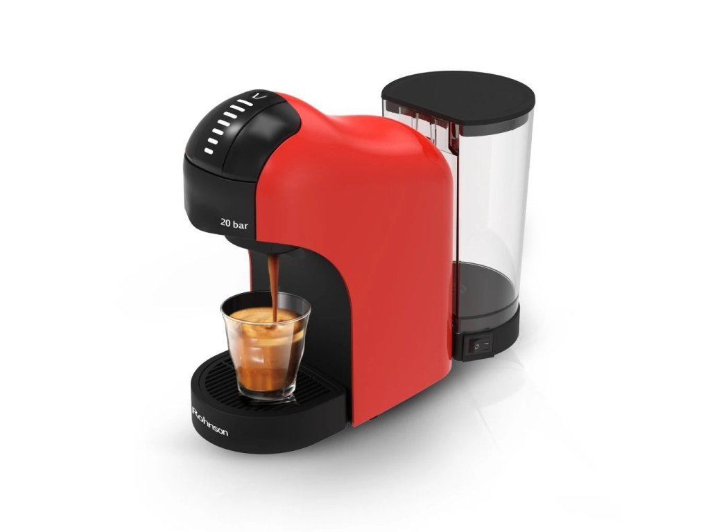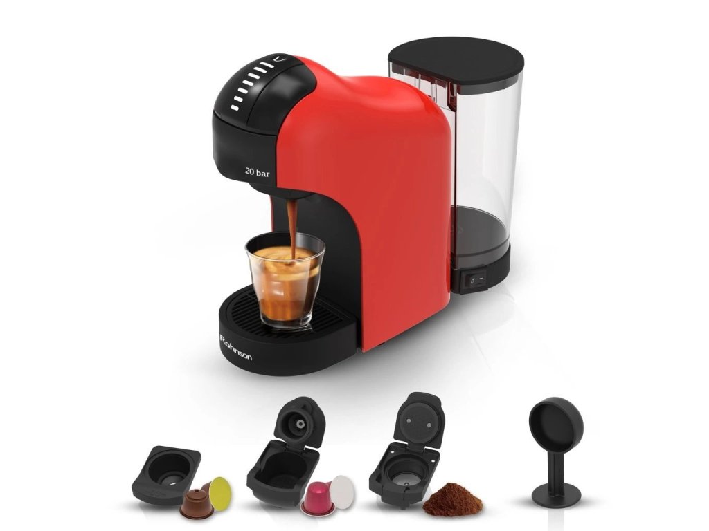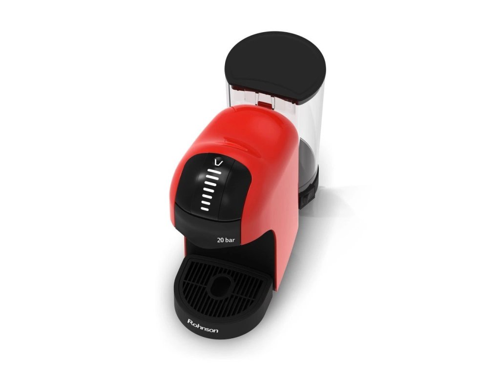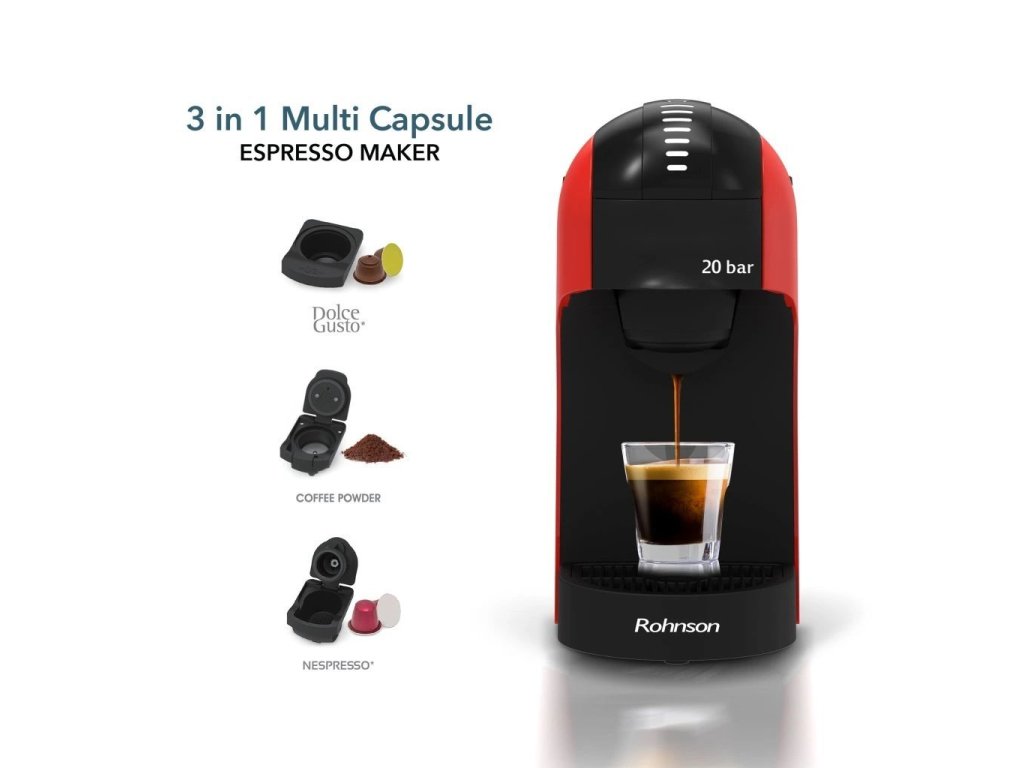 Kávovar na kapsle značky Nespresso, Dolce Gusto či na mletou kávu, s příkonem 1400W, vysokotlaká extrakce 20 barů, 7 úrovní množství hotové kávy, odnímatelný průhledný zásobník na vodu o objemu 0,85l.
