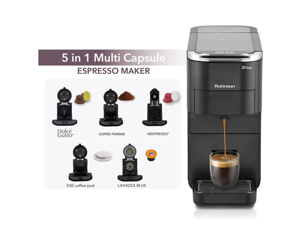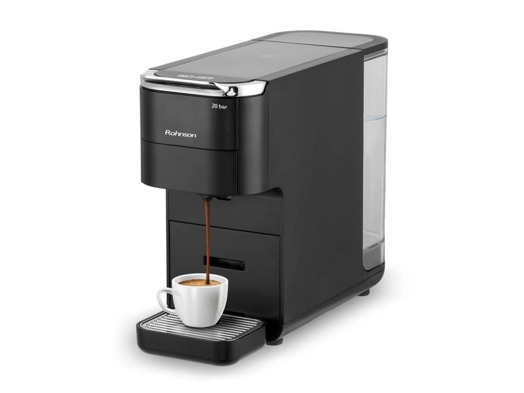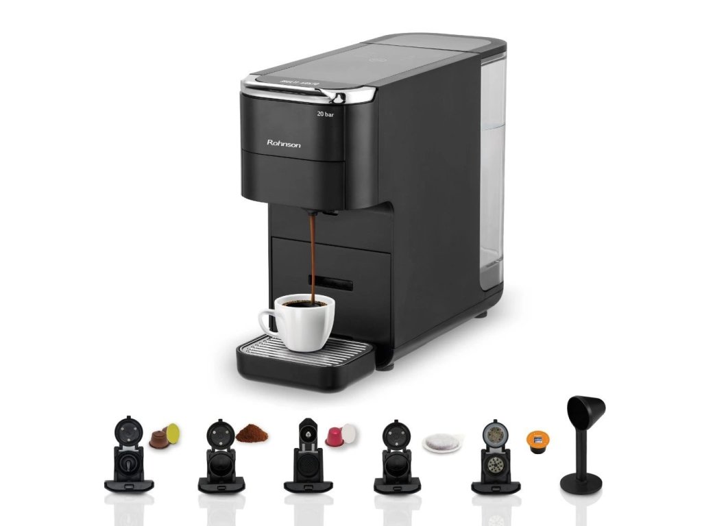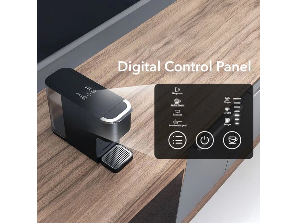 Kávovar na kapsle značky Nespresso, Dolce Gusto Lavazza Blue, ESE pody a na mletou kávu, s příkonem 1215-1545W, vysokotlaká extrakce 20 barů, 7 úrovní množství hotové kávy, odnímatelný průhledný zásobník na vodu o objemu 1,5 l.