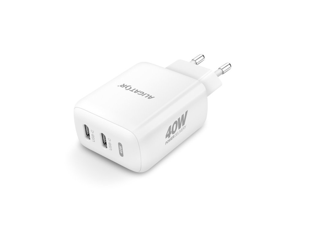 Výkonná síťová nabíječka řady „POWER DELIVERY“ v moderním bílém provedení s dvěma ultra rychlými USB-C porty o výkonu 40W.