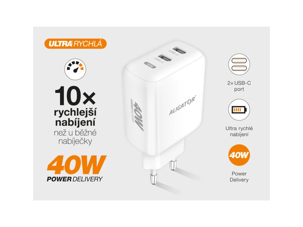 V dnešní době jsou již konektory USB-C s podporou protokolu PD standardem pro nabíjení mobilních zařízení. Chytrá síťová nabíječka ALIGATOR POWER DELIVERY 40W zvládne tak hravě doplnit energii dvěma přístrojům najednou díky ultra rychlým USB-C portům o celkovém výkonu až 40W. Tato nabíječka je ideálním pomocníkem pro dobíjení mobilních telefonů, tabletů a jiných zařízení.
