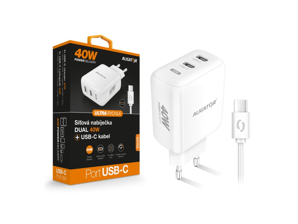 Rychlá nabíječka ALIGATOR, PD 40W, 2xUSB-C, USB-C/USB-C kabel, bílá
