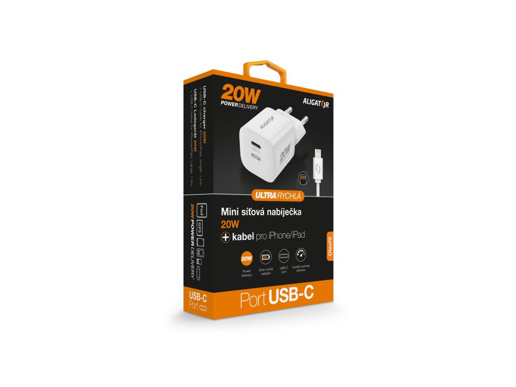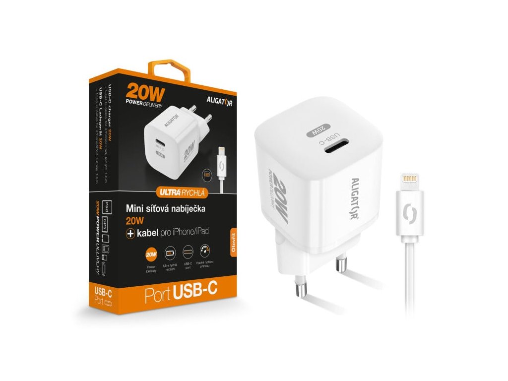 Rychlá mini síťová nabíječka USB-C ALIGATOR Power Delivery 20W s kabelem USB-C/Lightning pro iPhone/iPad