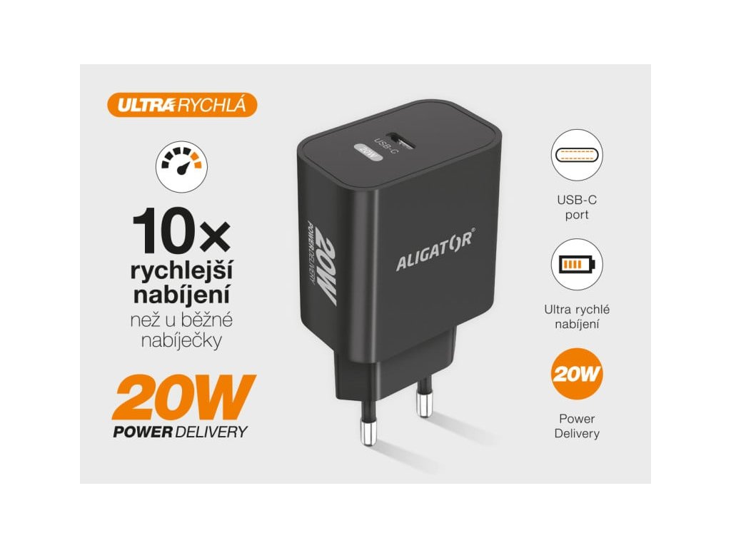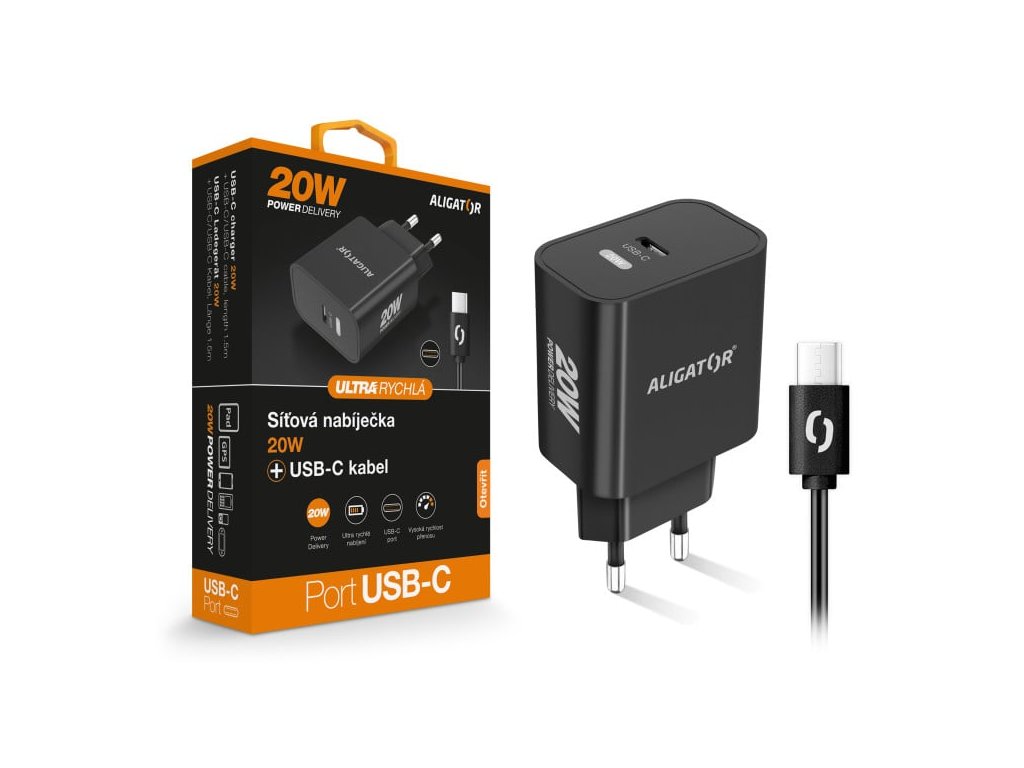 Rychlá síťová nabíječka USB-C ALIGATOR Power Delivery 20W s kabelem USB-C/USB-C