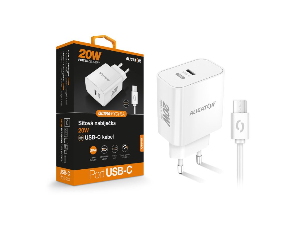 Rychlá síťová nabíječka USB-C ALIGATOR Power Delivery 20W s kabelem USB-C/USB-C
