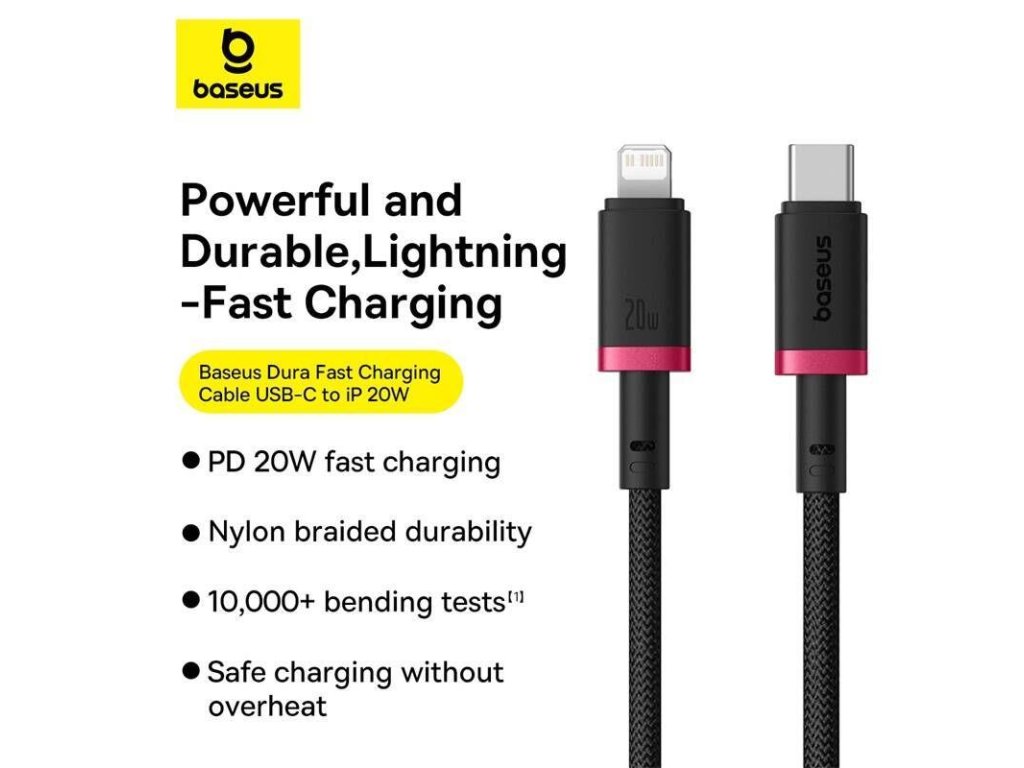 Kabel Baseus Dura USB-C/Lightning (20W) je ideální volbou pro ty, kdo hledají kombinaci rychlosti, odolnosti a spolehlivosti. Tento kabel nabízí výkonné nabíjení s podporou Power Delivery (PD) až do 20 W, což znamená, že vaše zařízení se nabíjejí rychleji než s běžnými kabely. Díky nylonovému opletu je kabel odolný vůči každodennímu opotřebení a roztržení, což prodlužuje jeho životnost. Při konstrukci byl kladen důraz na pevnost, protože kabel prošel více než 10 000 testy ohybu, což zaručuje jeho dlouhodobou odolnost i při intenzivním používání.