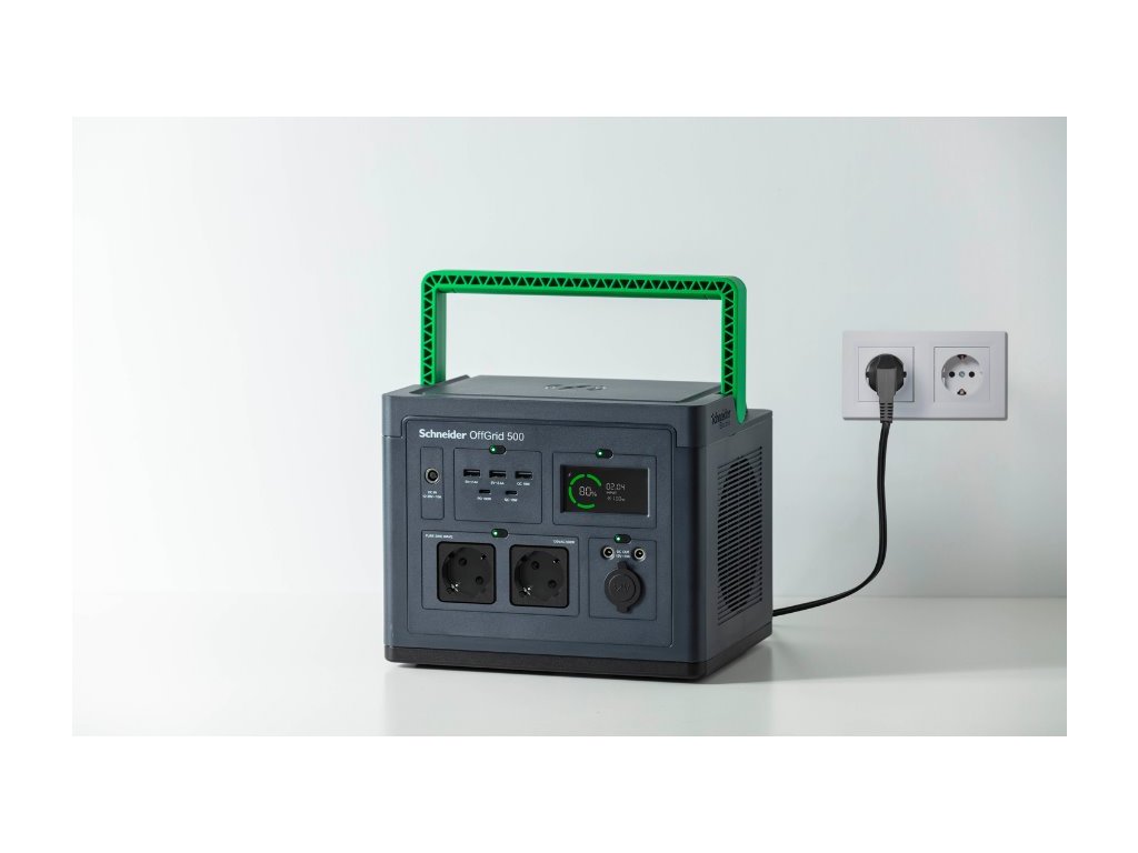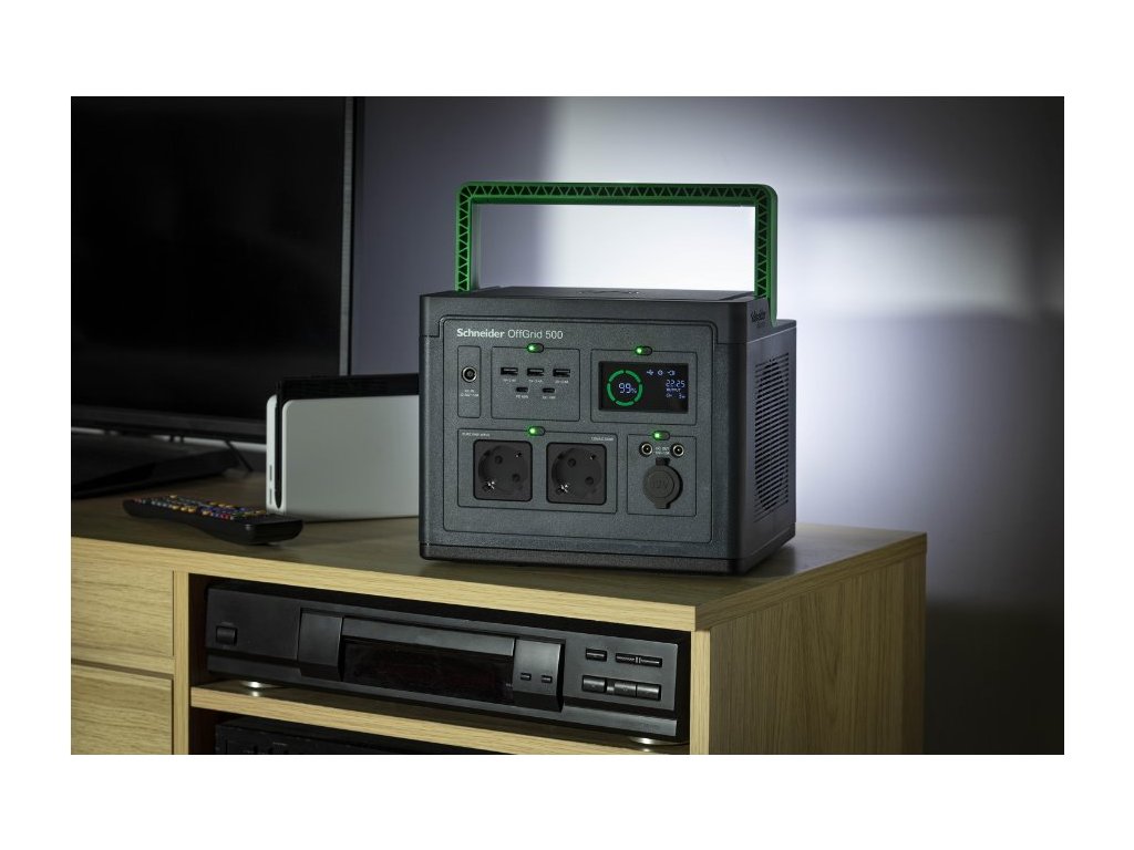 Přenosná energetická stanice Schneider OffGrid nabízí kapacitu 517 Wh a více než 500 cyklů. S různými výstupy, včetně Schuko, USB a bezdrátového nabíjení, je ideální pro napájení mobilních zařízení. Kompaktní design (5,5 kg) a robustní konstrukce.