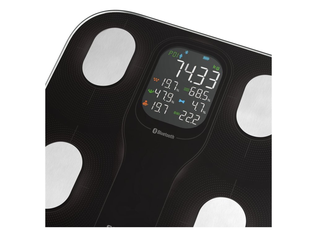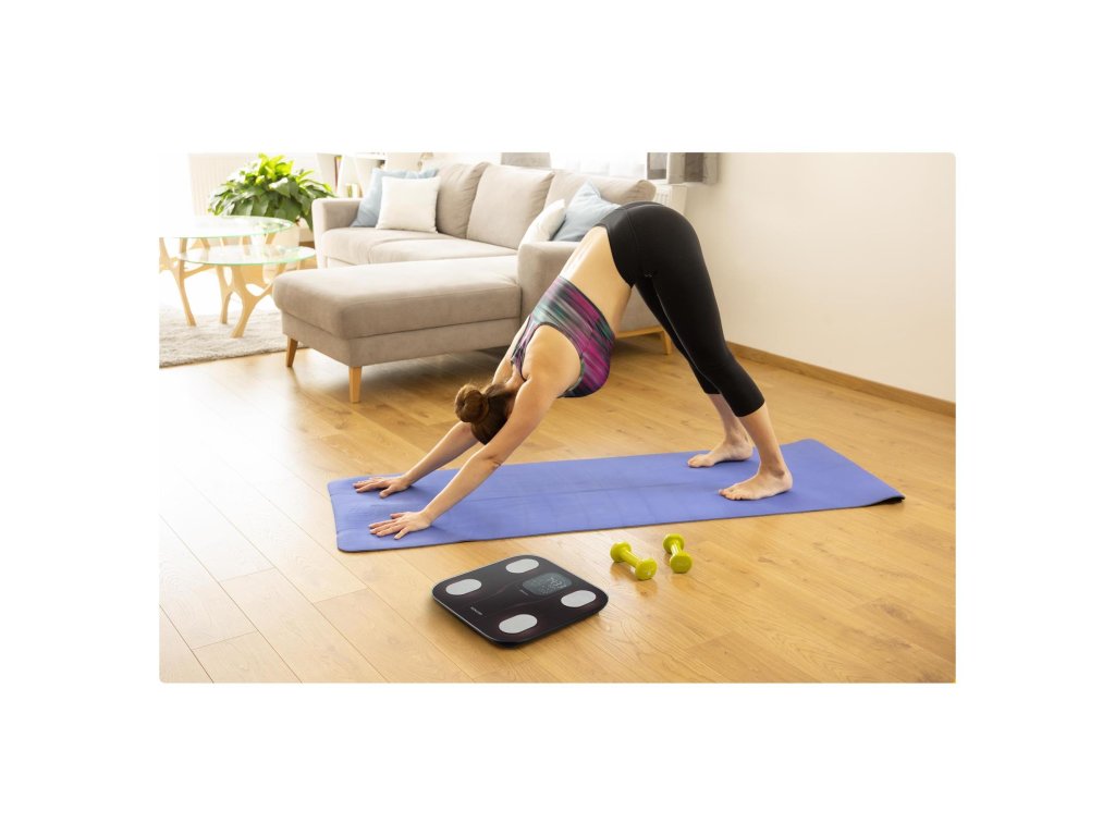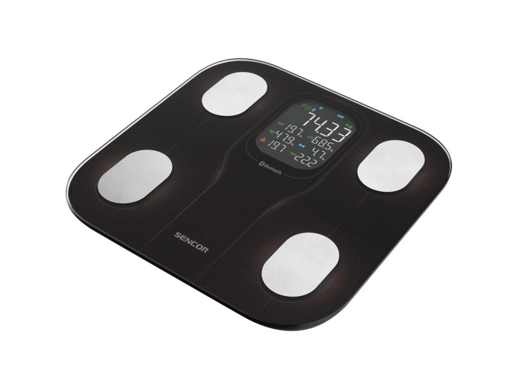 osobní váha, chytrá fitness váha s velkým displejem, propojení prostřednictvím BT s aplikací Sencor HOME, profil pro více uživatelů, historie měření, počítá BMI, % tuku, % vody, % svalů, % kostí