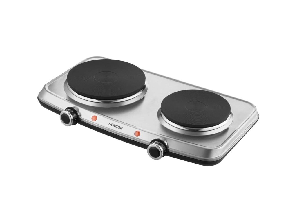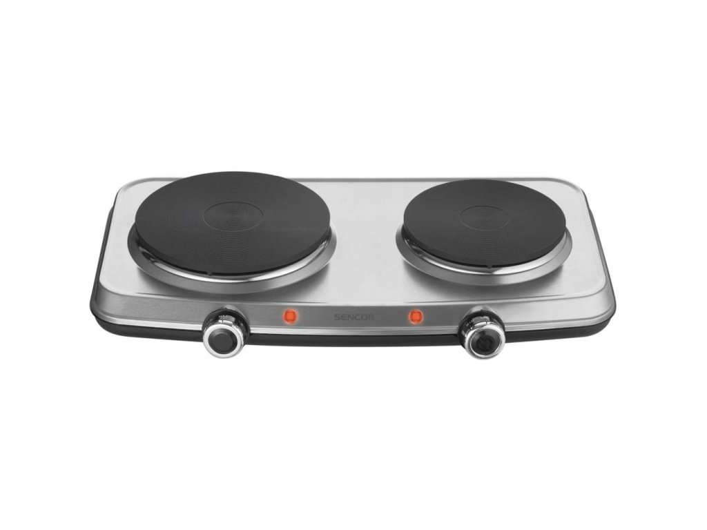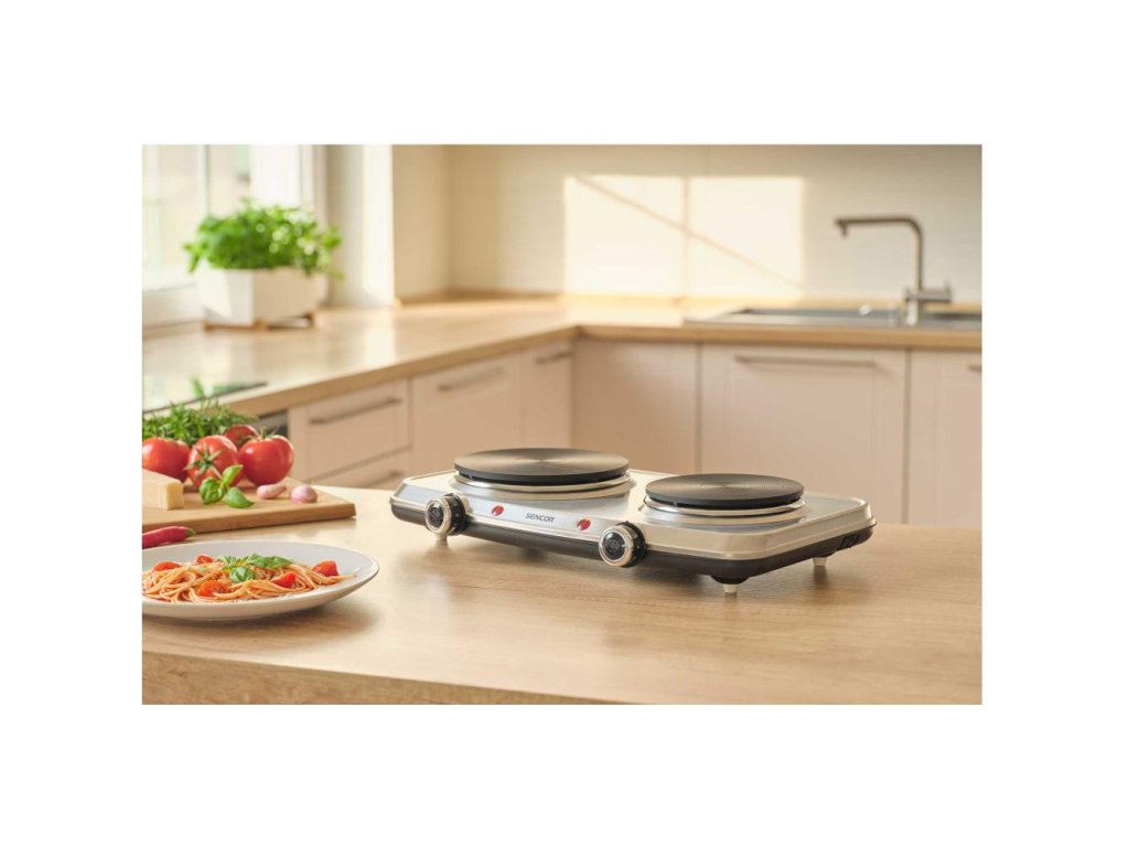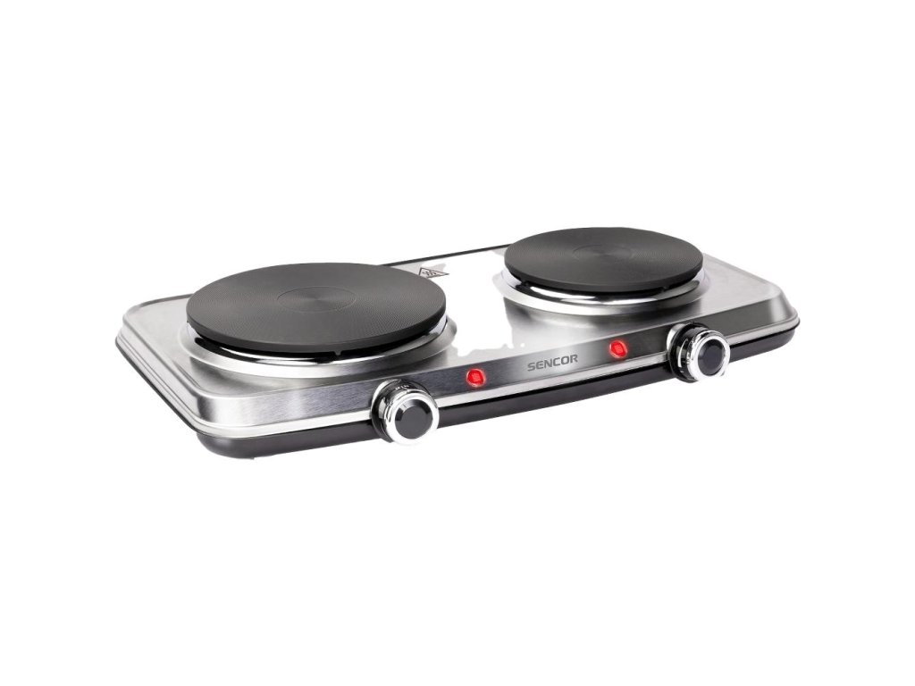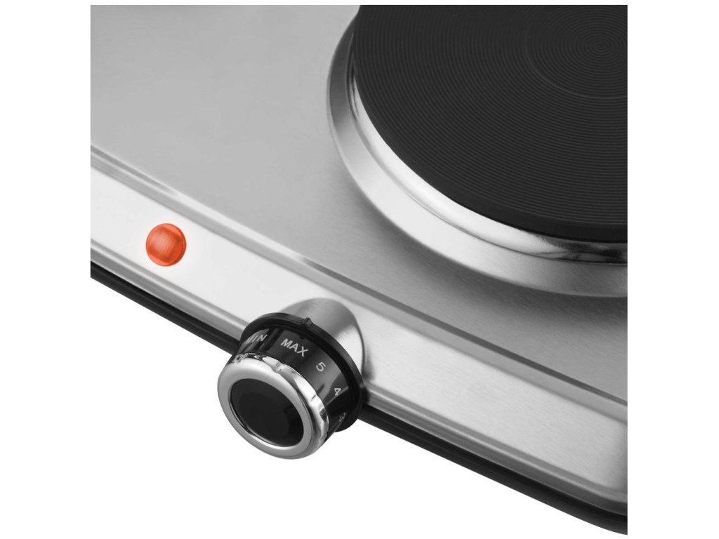 Elektrický vařič, Dvě plotny s průměrem 18 a 15 cm, Plynule regulovatelný termostat, Ochrana proti přehřátí, Kompaktní rozměry pro úsporu místa