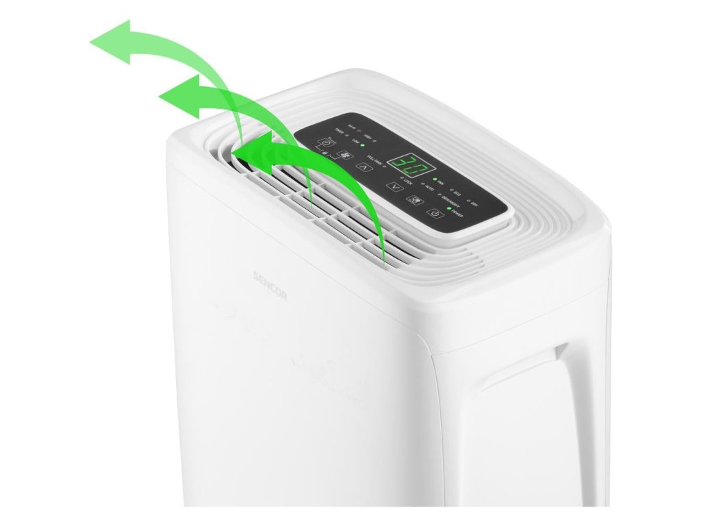 odvlhčovač vzduchu • pro velikost místnosti 35 m2 • odvlhčovací kapacita 10 l/den • objem nádoby 1,5 l • hlučnost 43 dB • regulace výkonu • časovač • automatické odvlhčování • systém „turbo“ pro sušení prádla • indikace plného zásobníku • dotykový panel