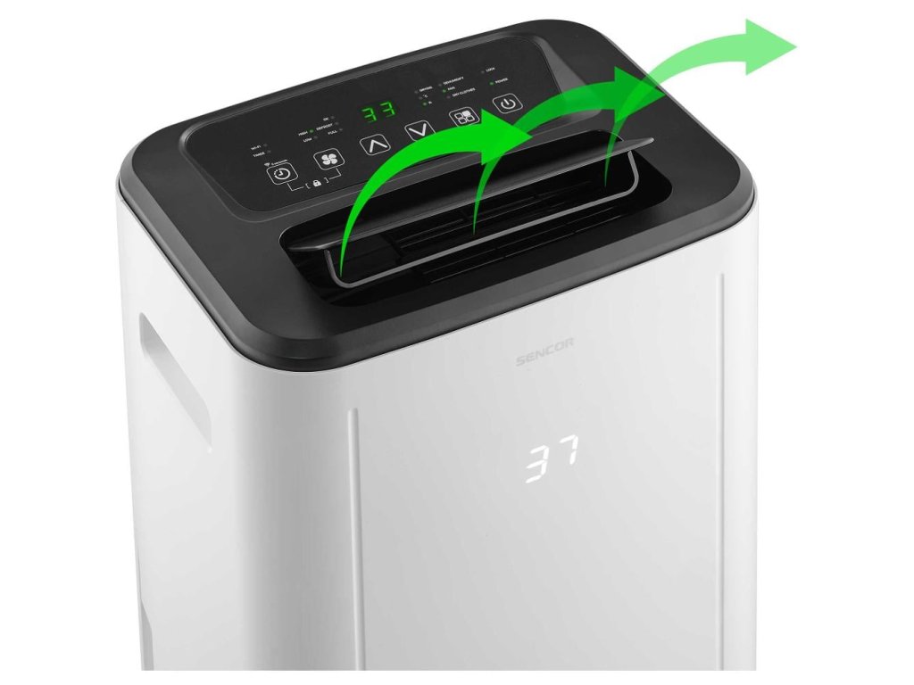 odvlhčovač vzduchu • pro velikost místnosti 89 m2 • odvlhčovací kapacita 30 l/den • objem nádoby 6 l • hlučnost 43 dB • regulace výkonu • časovač • automatické odvlhčování • systém „turbo“ pro sušení prádla • indikace plného zásobníku • dotykový panel