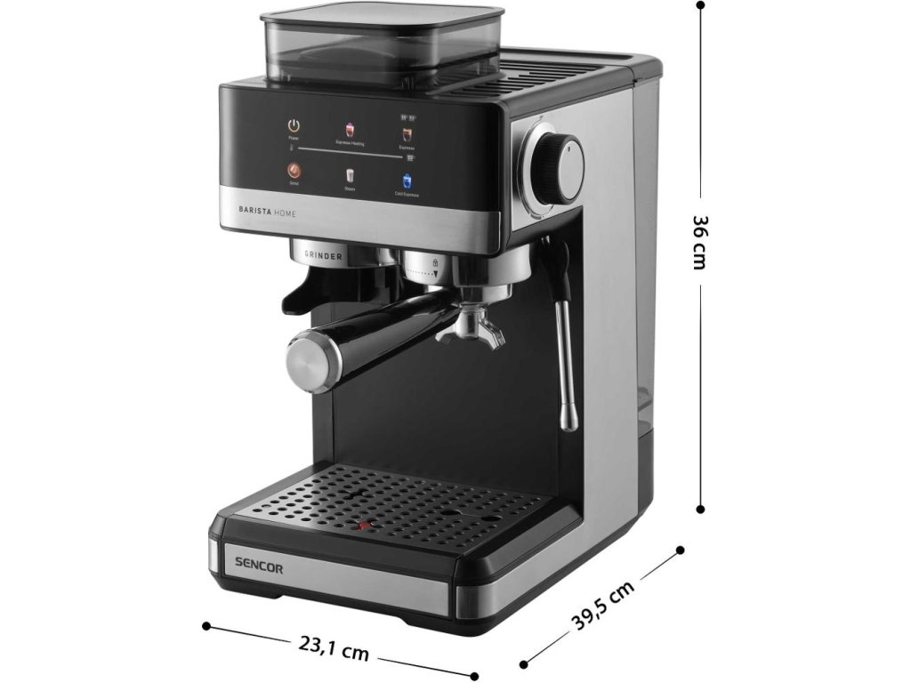 Pákové espresso s mlýnkem, čerpadlo s tlakem 20 barů, barevný dotekový displej, systém ohřevu Thermoblock, funkce předspaření, otočná parní tryska, nerezový nahřívač šálků, nádržka na vodu 1,8 l