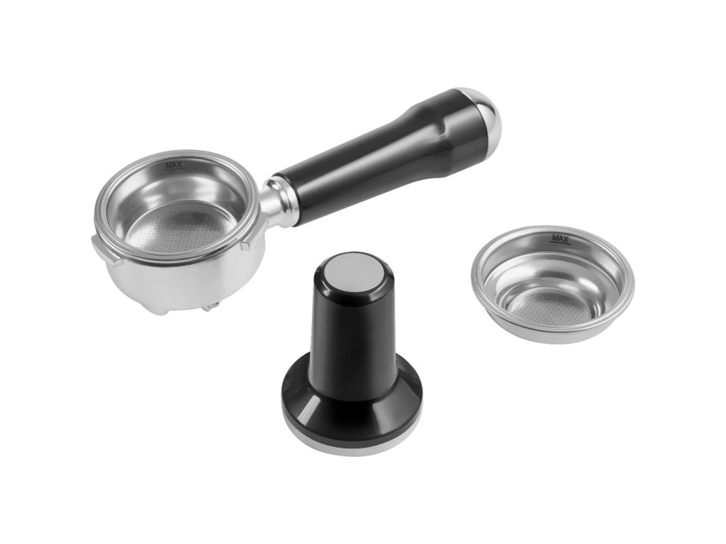 Příslušenství: Držák filtru - páka, odměrka, 2 filtry (pro 1 a 2 šálky), konvička na mléko, čisticí sada, tamper - pěchovadlo