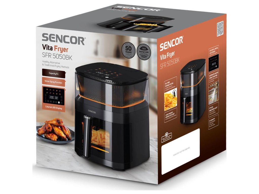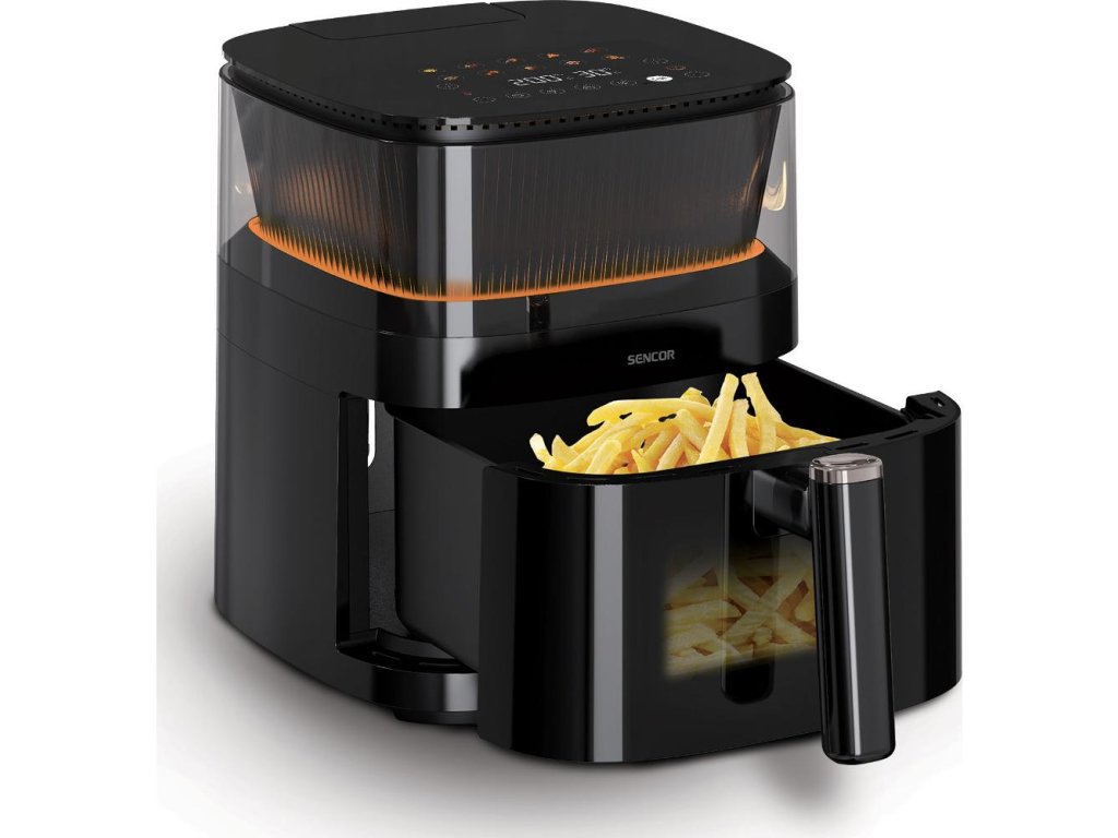 horkovzdušná fritéza • příkon 1 500 W • objem fritovacího koše 5l • LED displej • funkce rozprašování vody • 10 volitelných programů • regulace teploty v rozsahu 40–200 °C