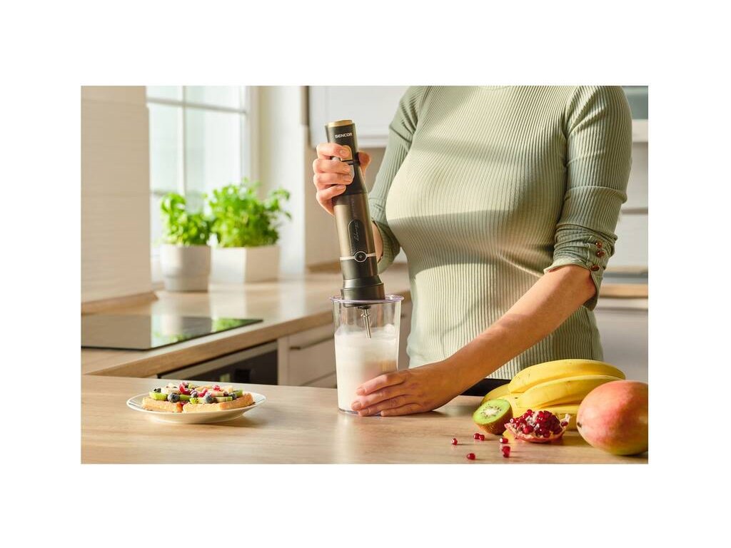 ponorný mixér • příkon 1 200 W • nástavec na sekání, šlehání • mačkač brambor • nádoba na sekání o objemu 500 ml • pracovní nádoba o objemu 800 ml • ergonomická rukojeť • materiál mixéru: nerez • pulzní spínač • plynulá regulace otáček