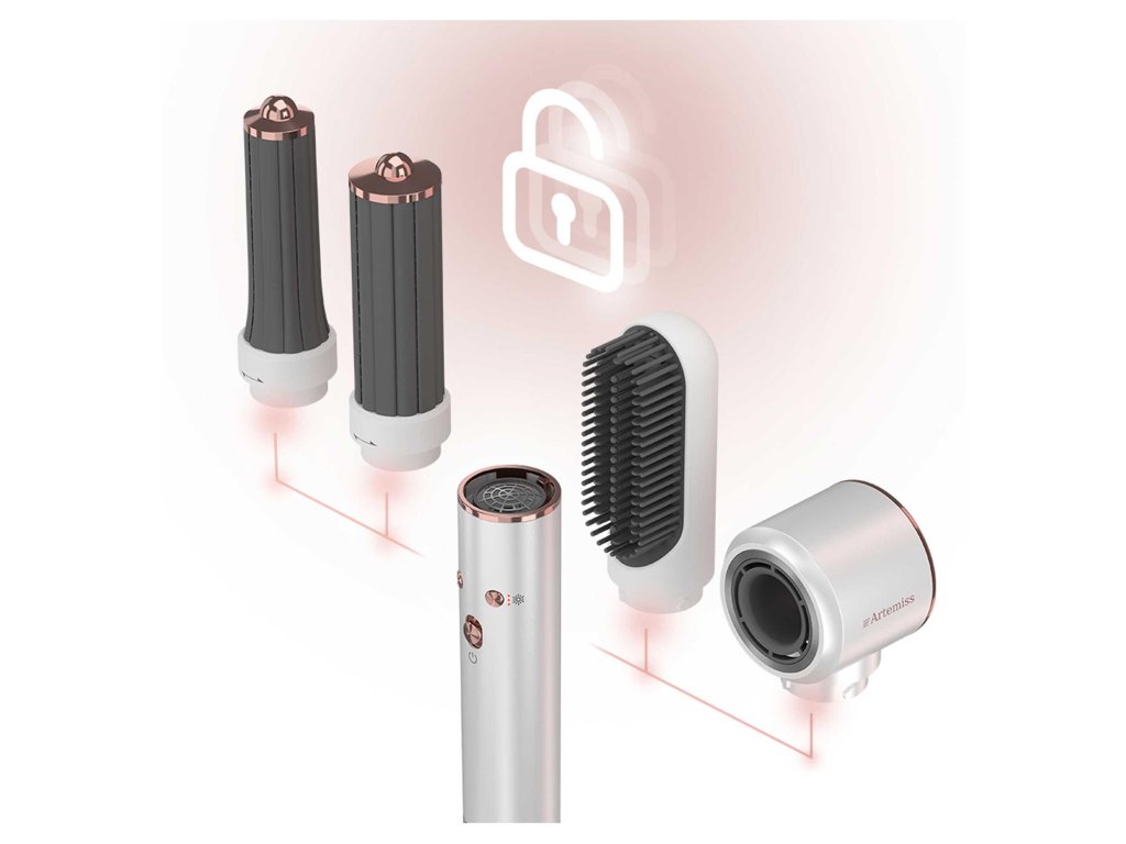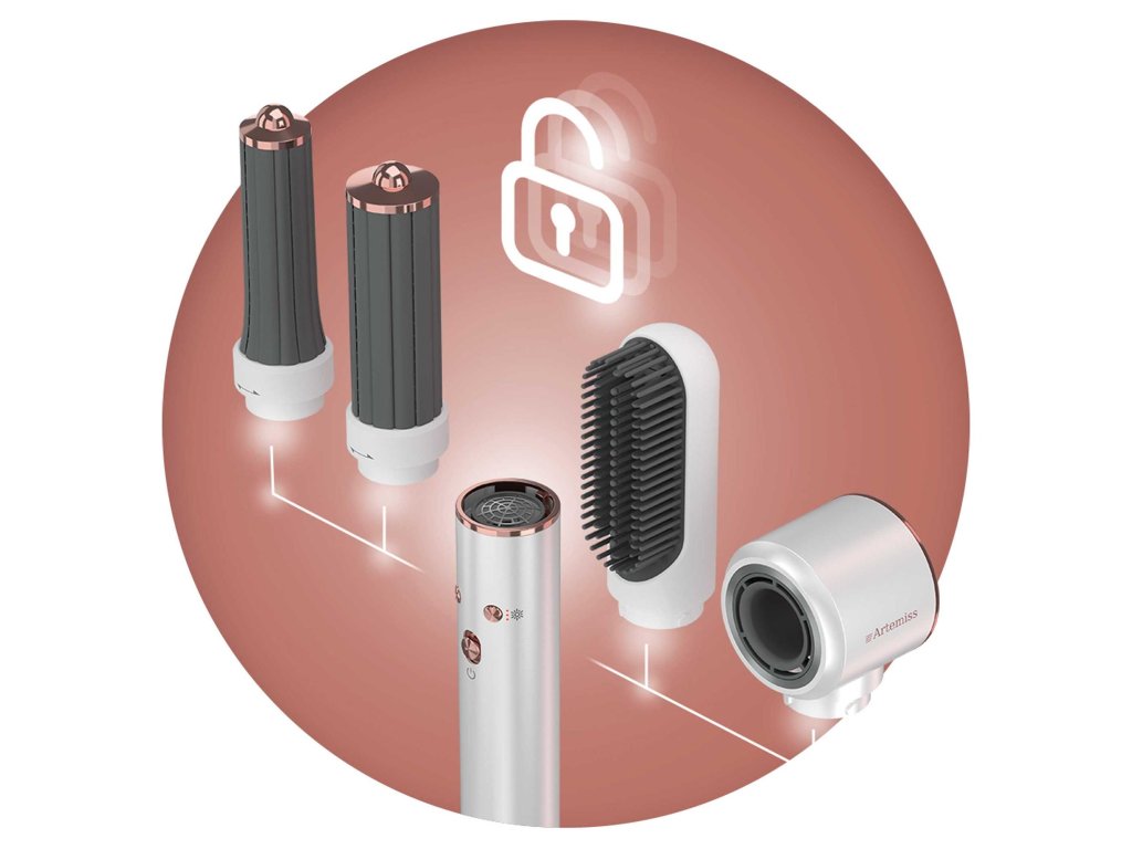 Jednotlivé nástavce lze velmi snadno vyměnit. Stačí jen uvolnit zámek pojistky na zadní straně kulmofénu Artemiss, vytáhnout nástavec, zaměnit za jiný a zámek pojistky pustit. Součástí je i jeden magnetický nástavec, který skvěle pasuje na hlavici pro vysoušení vlasů, a přináší tak další možnost stylingu.