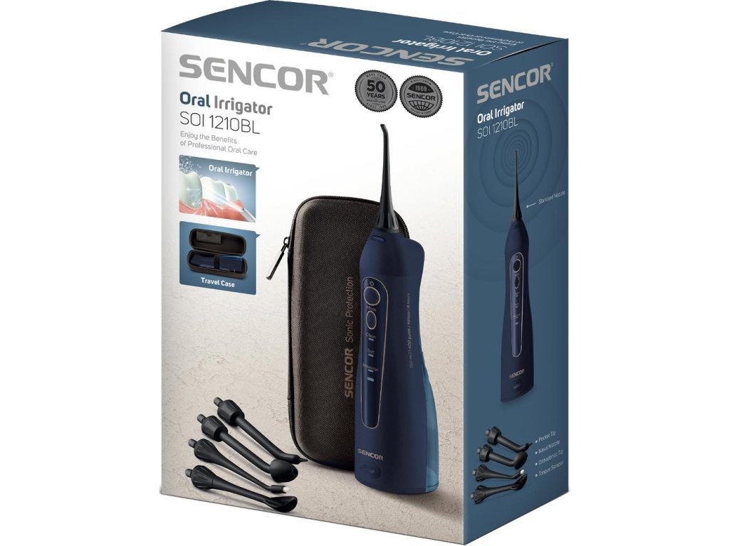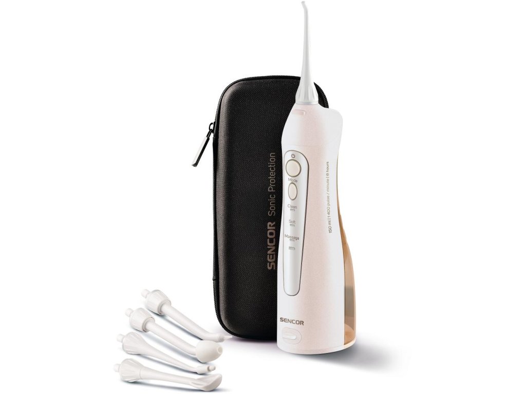 ústní sprcha • cestovní • pro můstky, korunky a rovnátka • 3 programy • trysky standardní • ortodontické a na jazyk • 5 trysek v balení • objem nádržky 150 ml • režimy čištění • 3 stupně intenzity • 1400 impulzů