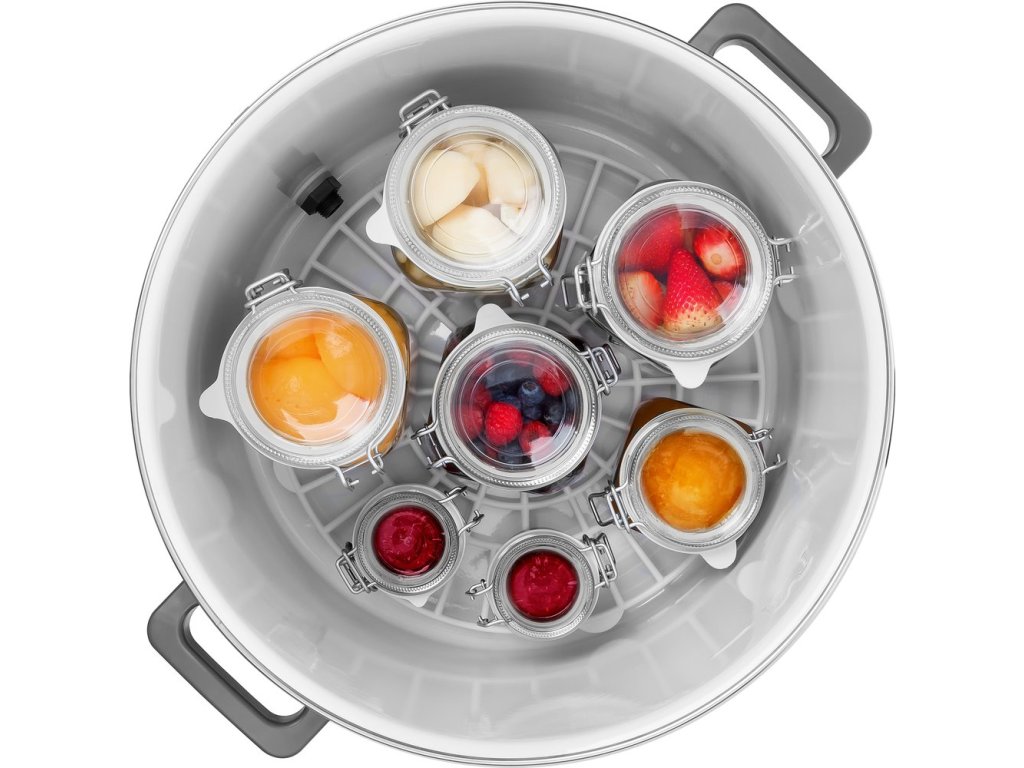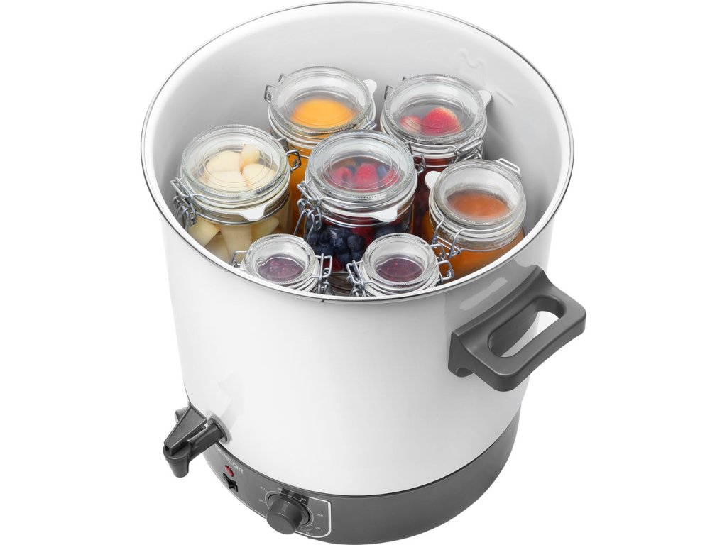 Vyberte si ze dvou přednastavených zavařovacích režimů. Buď lze využít nastavitelný časový spínač a zvolit si teplotu v rozmezí od 20 do 120 minut, nebo aktivovat nepřetržitý chod. Za pomoci plynule regulovatelného termostatu můžete upravovat teplotu od 30 do 100 °C v závislosti na připravovaných zavařeninách. K bezpečnosti práce přispívají tepelně izolované rukojeti, skryté topné těleso a akustický indikátor dosažení teploty. Nechybí ani pojistka proti přehřátí a chodu naprázdno, aby bylo použití zařízení vždy maximálně bezpečné.