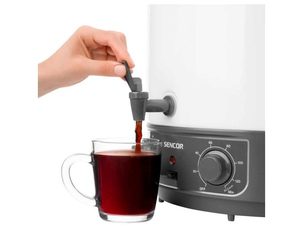 Vestavěný výtokový kohout vhodný pro stáčení např. svařeného vína, čaje, punče nebo jiných horkých nápojů