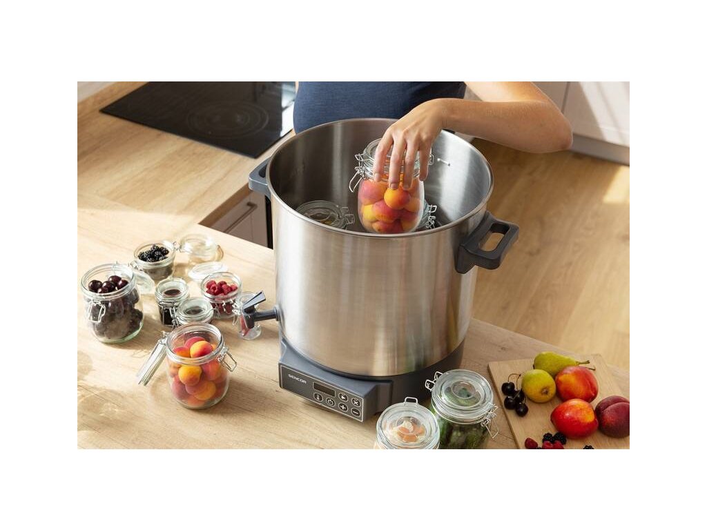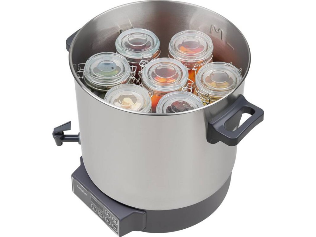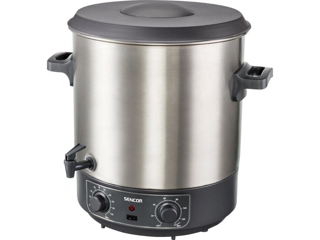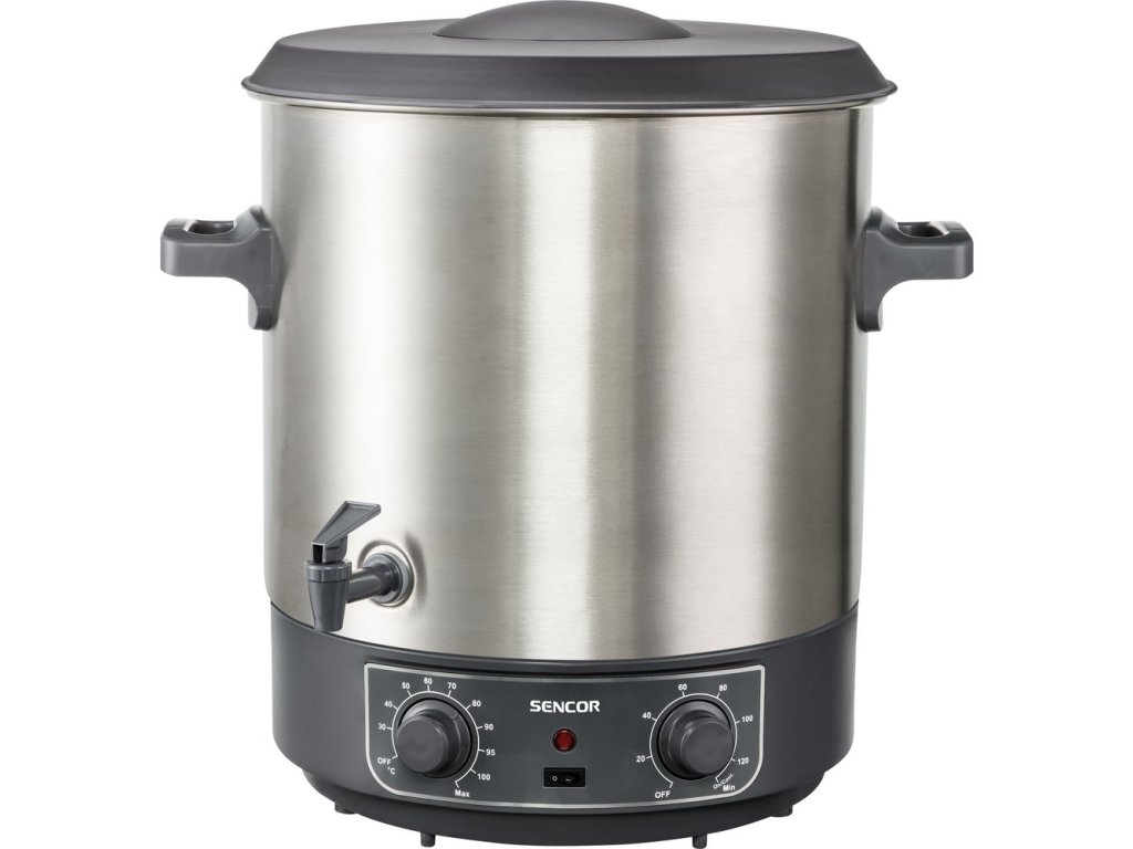 elektrický zavařovací hrnec • automatické řízení teploty • příkon 1 800 W • objem 27 litrů • nastavení teploty 30 – 100 °C • časový spínač 20-120 min. • rošt na sklenice • odnímatelné víko • výpustný kohout • ochrana proti přehřátí