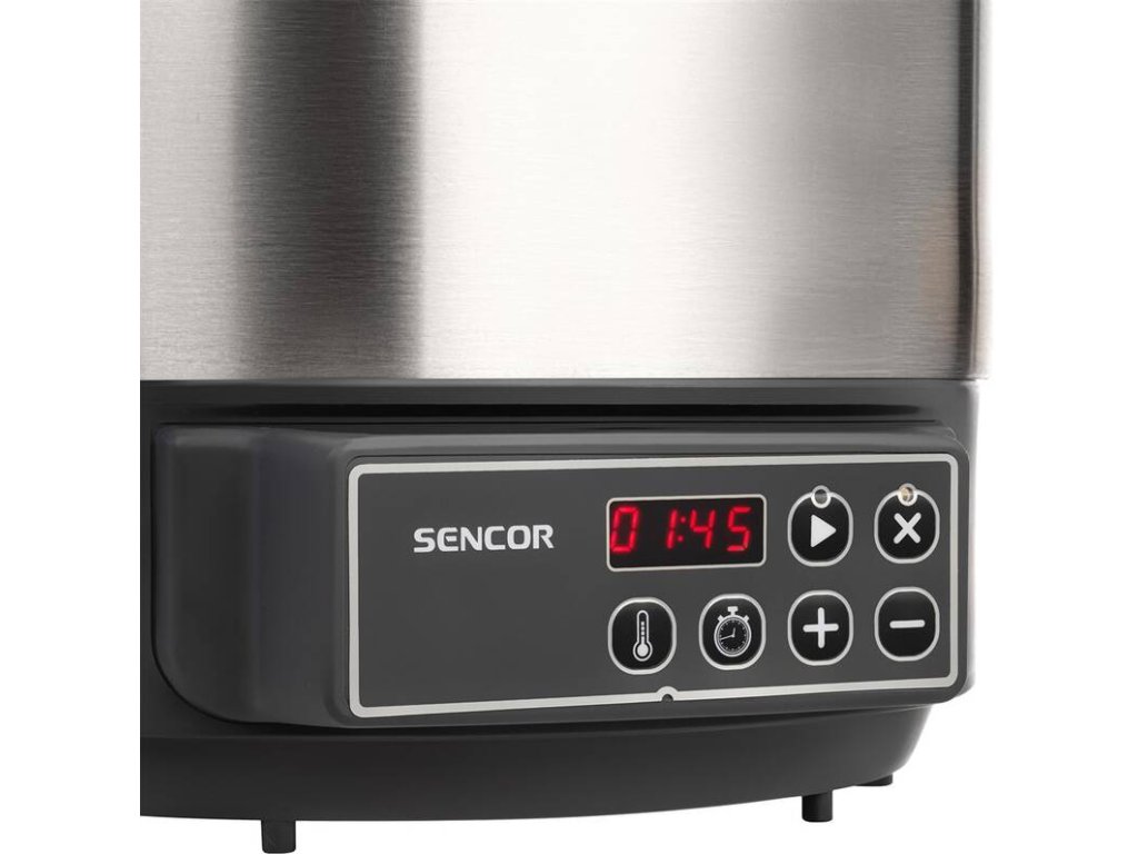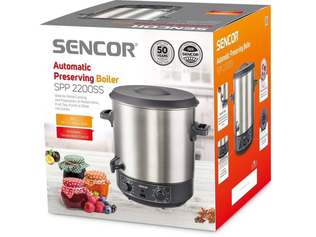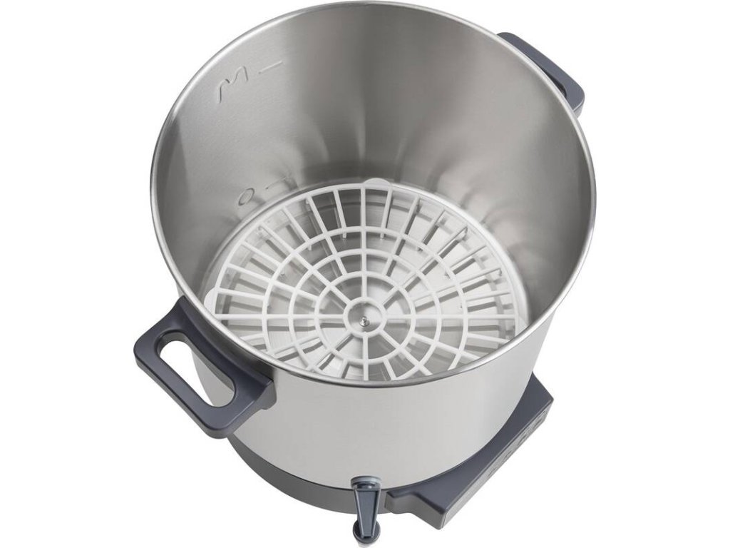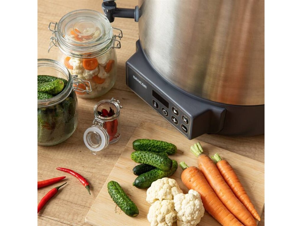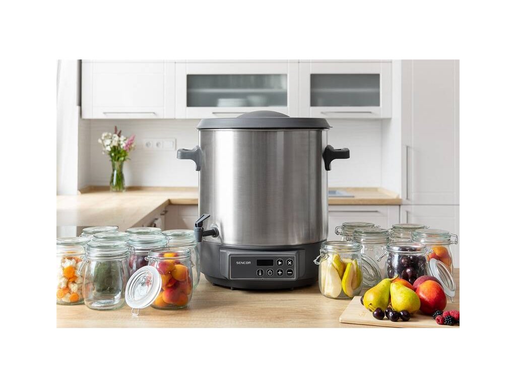 elektrický zavařovací hrnec • automatické řízení teploty • příkon 1 800 W • objem 27 litrů • nastavení teploty 30 – 100 °C • časový spínač 20-120 min. • rošt na sklenice • odnímatelné víko • výpustný kohout • ochrana proti přehřátí