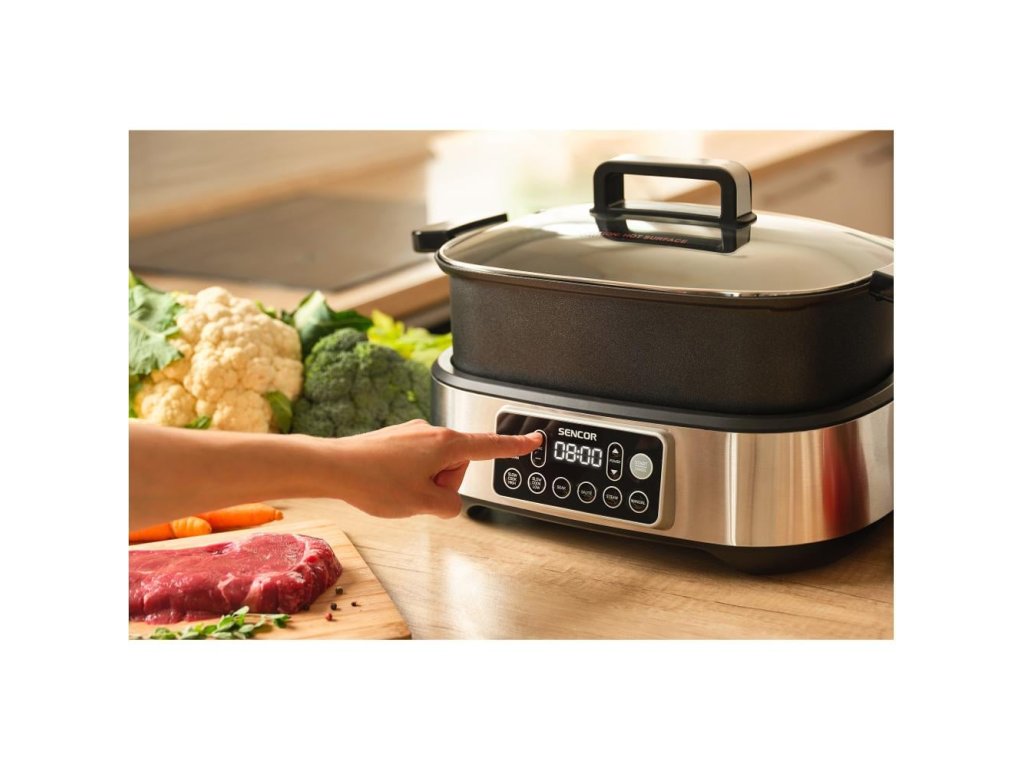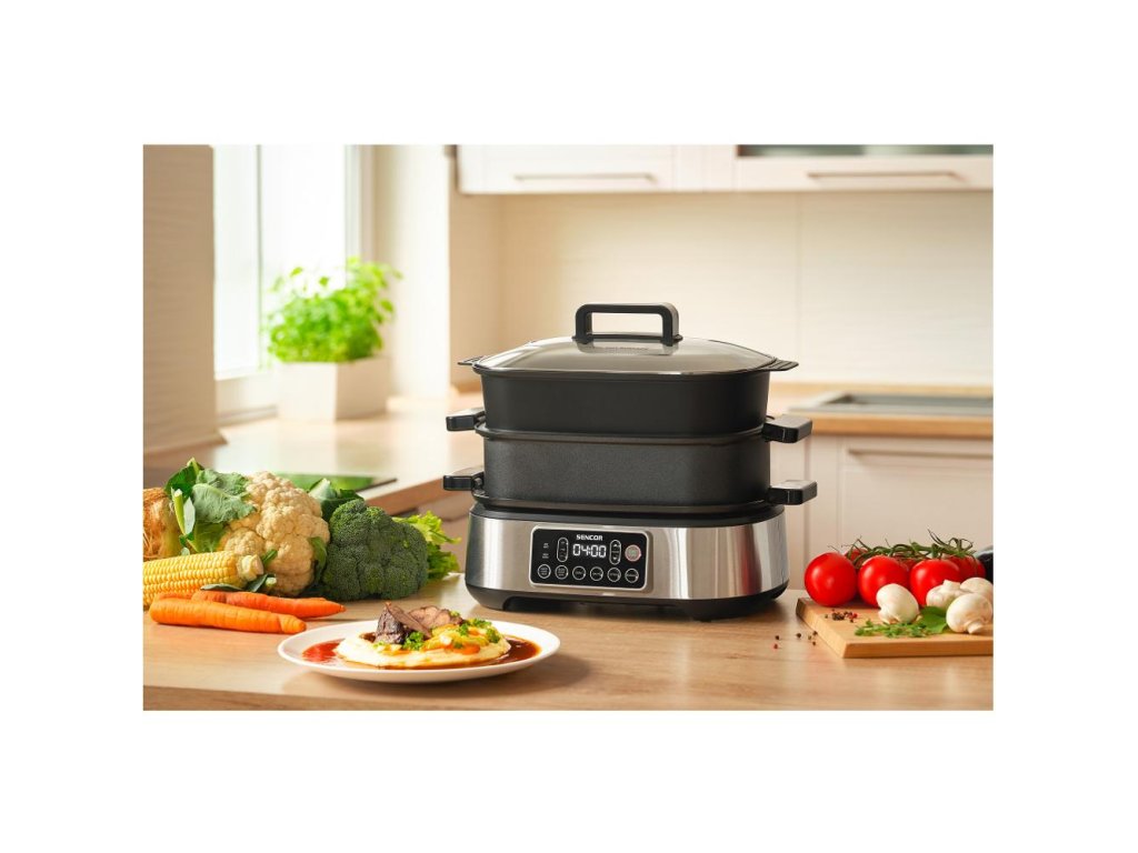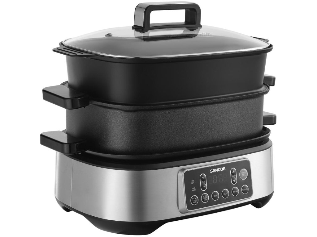 Nový multifunkční pomalý hrnec Sencor SPR 6300BK připraví jídlo výrazně pohodlněji a s minimálním úsilím. Nabízí objem 6 litrů a v 5 nastavených programech si můžete vybrat různé varianty přípravy jídel od pomalého vaření přes úpravu surovin na páře až po grilování. Připravené jídlo bude vždy lahodné a šťavnaté s tou správnou texturou. Multifunkční hrnec se vám maximálně přizpůsobí i díky manuálnímu programu s vlastním nastavením času a teploty (40–200 °C) a ušetří práci i čas strávený v kuchyni. Veškeré ovládání je snadno přístupné s LED podsvíceným displejem. Je vybaven praktickým příslušenstvím – pokličkou z tvrzeného skla, hliníkovou grilovací pánví a napařovací plastovou nádobou.