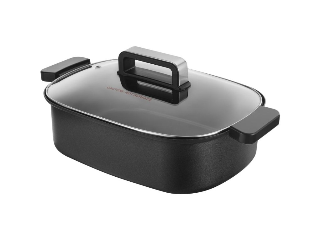 pomalý hrnec • objem 6 l • digitální displej • 5 přednastavených programů • zcela automatický provoz • rozsah teplot: 40 – 200 °C • hliníková grilovací pánev • plastová napařovací nádoba • poklička z tvrzeného skla